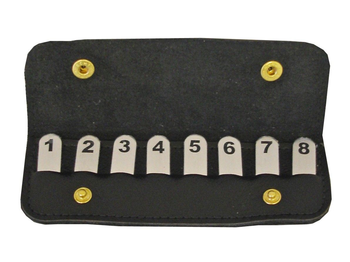 Black leather case holds eight numbered pegs.