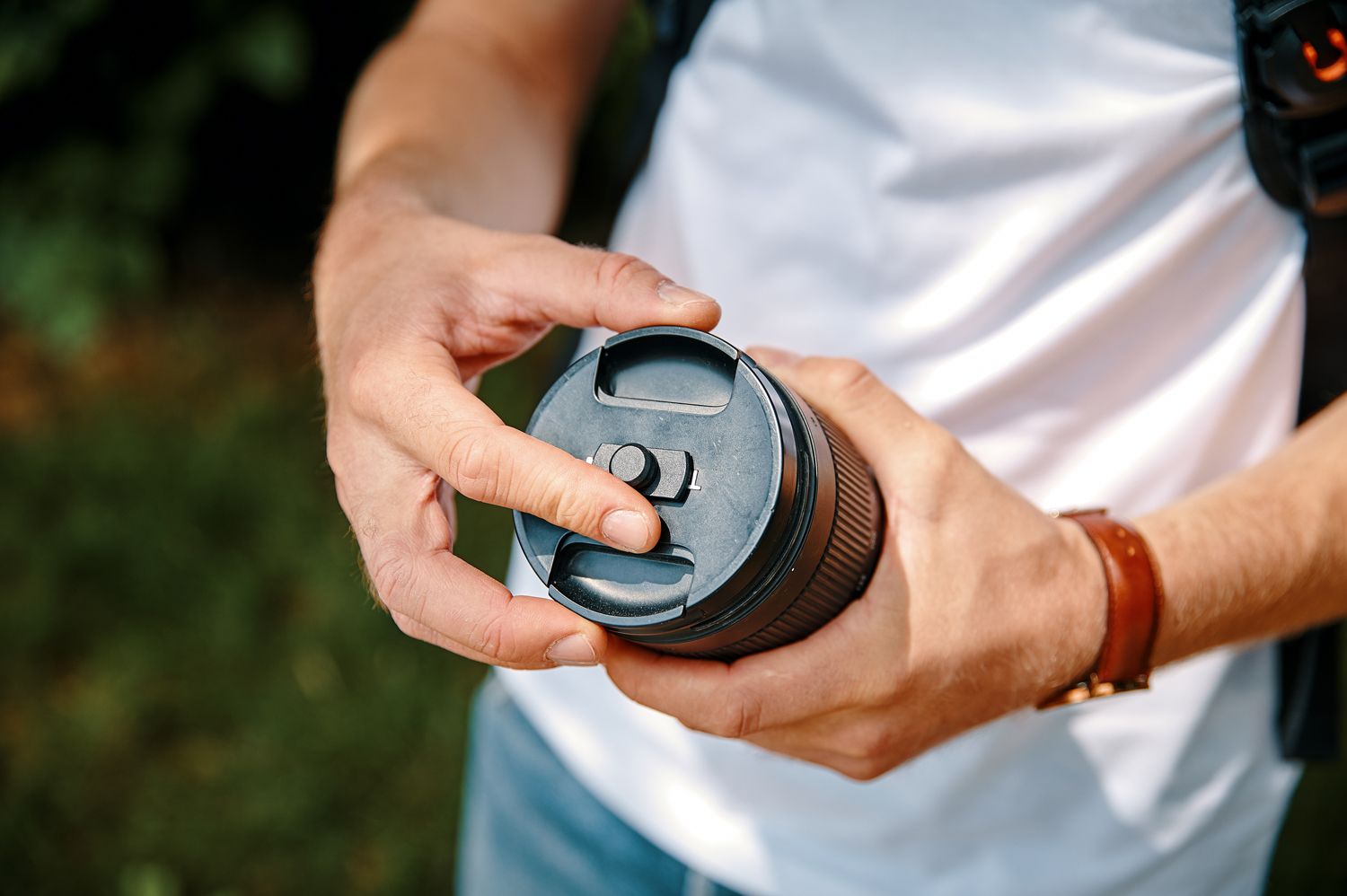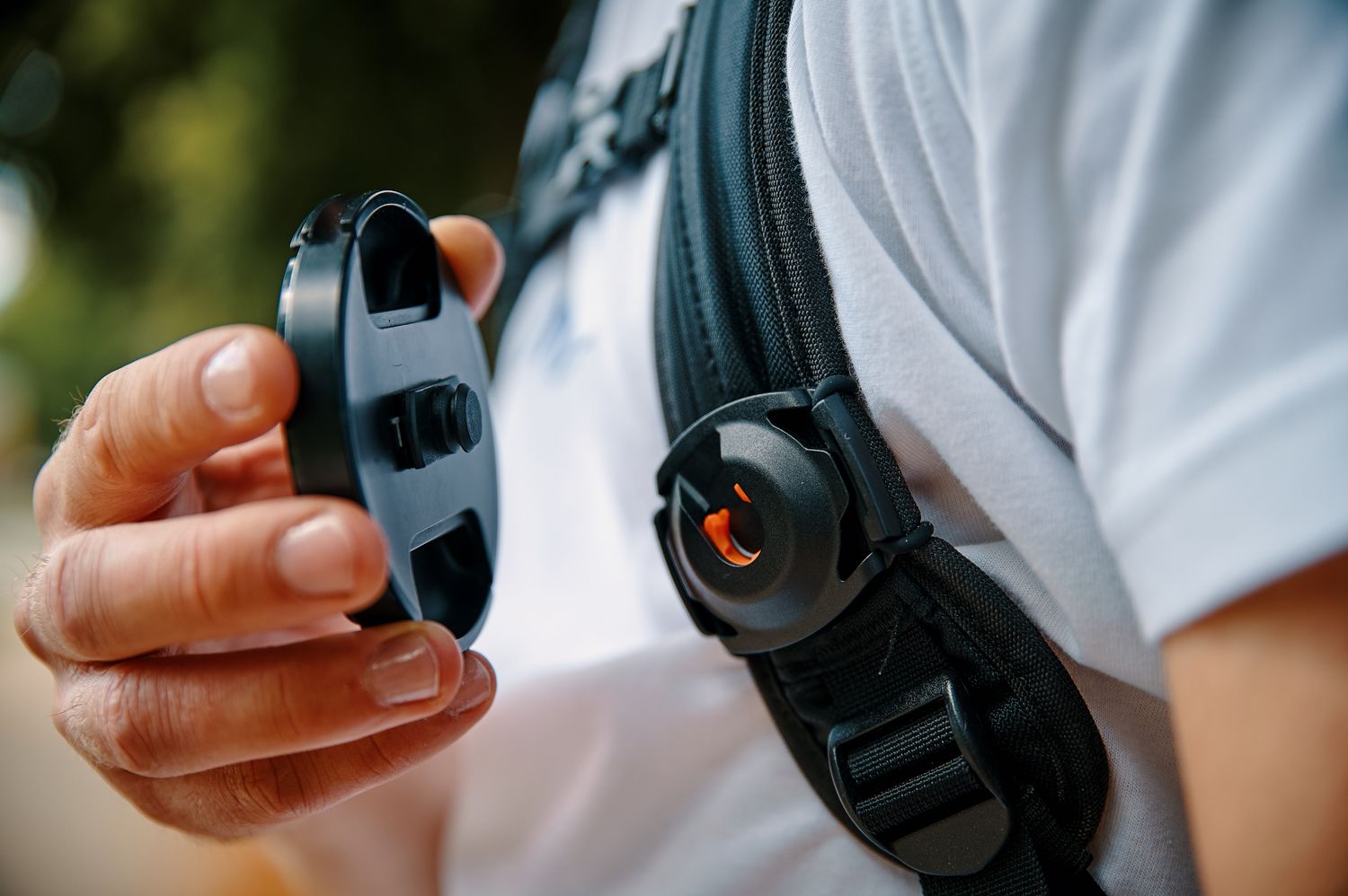 Reliable equipment for more concentration for the perfect shot: the SNAPSNAP lens cap clip offers a cordless attachment of the lens cap to the shoulder strap of the backpack. With the patented system, the magnet-mechanical mount is attached to the shoulder strap and the matching counterpart is sticked onto the lens cap. Therefore, the lens cap has a fixed and secure position and always remains within reach. The fastener releases automatically as soon as the lens cap is lifted straight up.