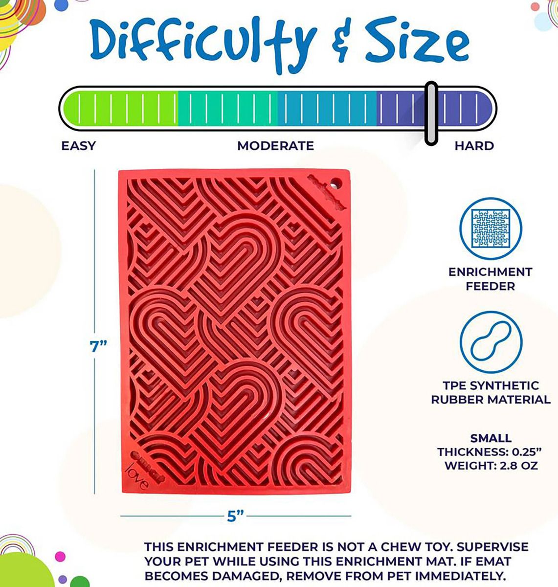 WARNING: This is not a chew toy. Supervise your pet while using this enrichment mat. If emat becomes damaged, remove from pet immediately.