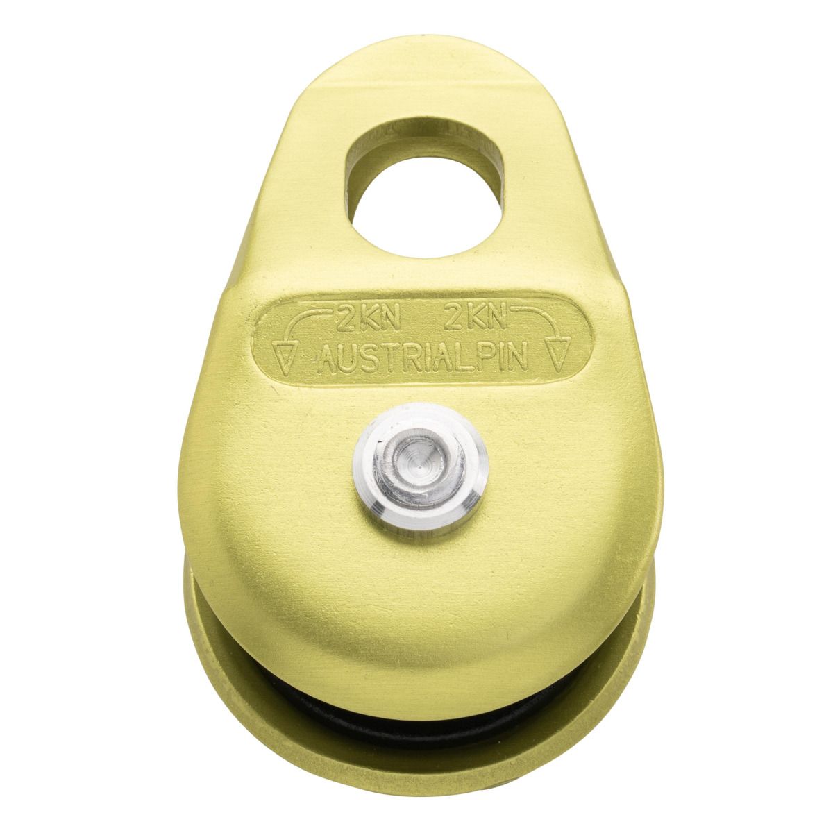 Rope pulley with hinged side tabs and plastic pulley for a maximum rope diameter of 12 mm.