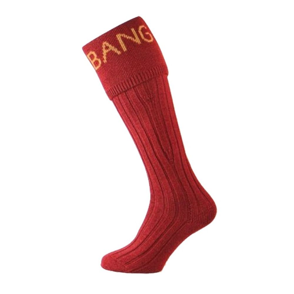 Quality long stockings in red with yellow "Bang Bang" type. 50% wool, 50% acrylic mix.