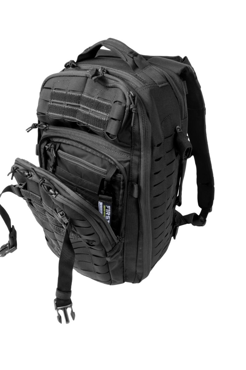 Ingenious Hook and Hang Thru™ System compartment unzips top and bottom, allowing specialized items like First Tactical Rifle Sleeves or other oversized tactical gear or hanging items to slide through and securely hook & hang in place.