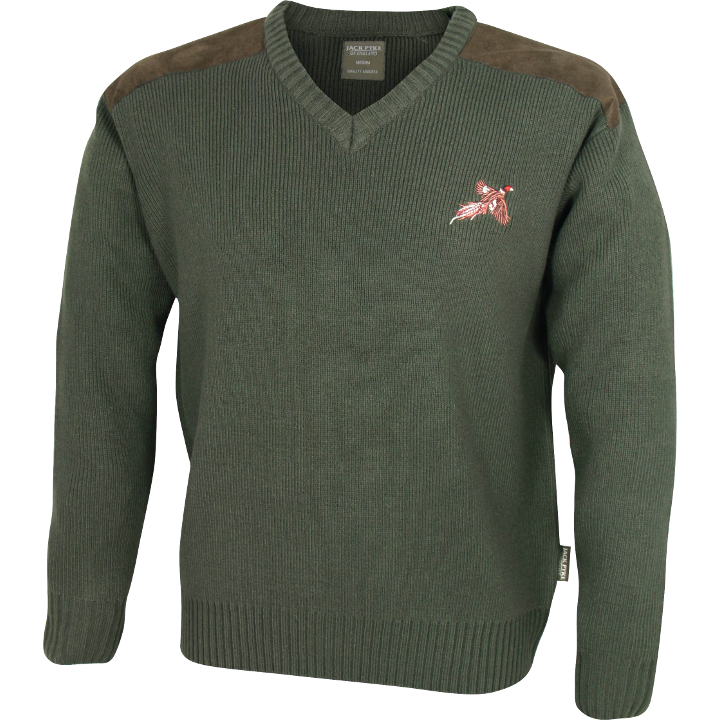 V-neck with suedlite shoulders with embroidered pheasant logo.