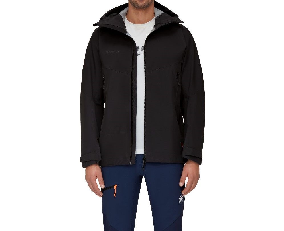 Crater HS Hooded Jacket Men. The absolute all-arounder on the mountain. 3-layer jacket with waterproof Gore-Tex® membrane. The jacket comes with smart features such as a helmet-compatible hood, underarm zippers for optimum ventilation and climbing harness-compatible side pockets. The alpine jacket in a classic timeless design: Crater HS Hooded Jacket Men.