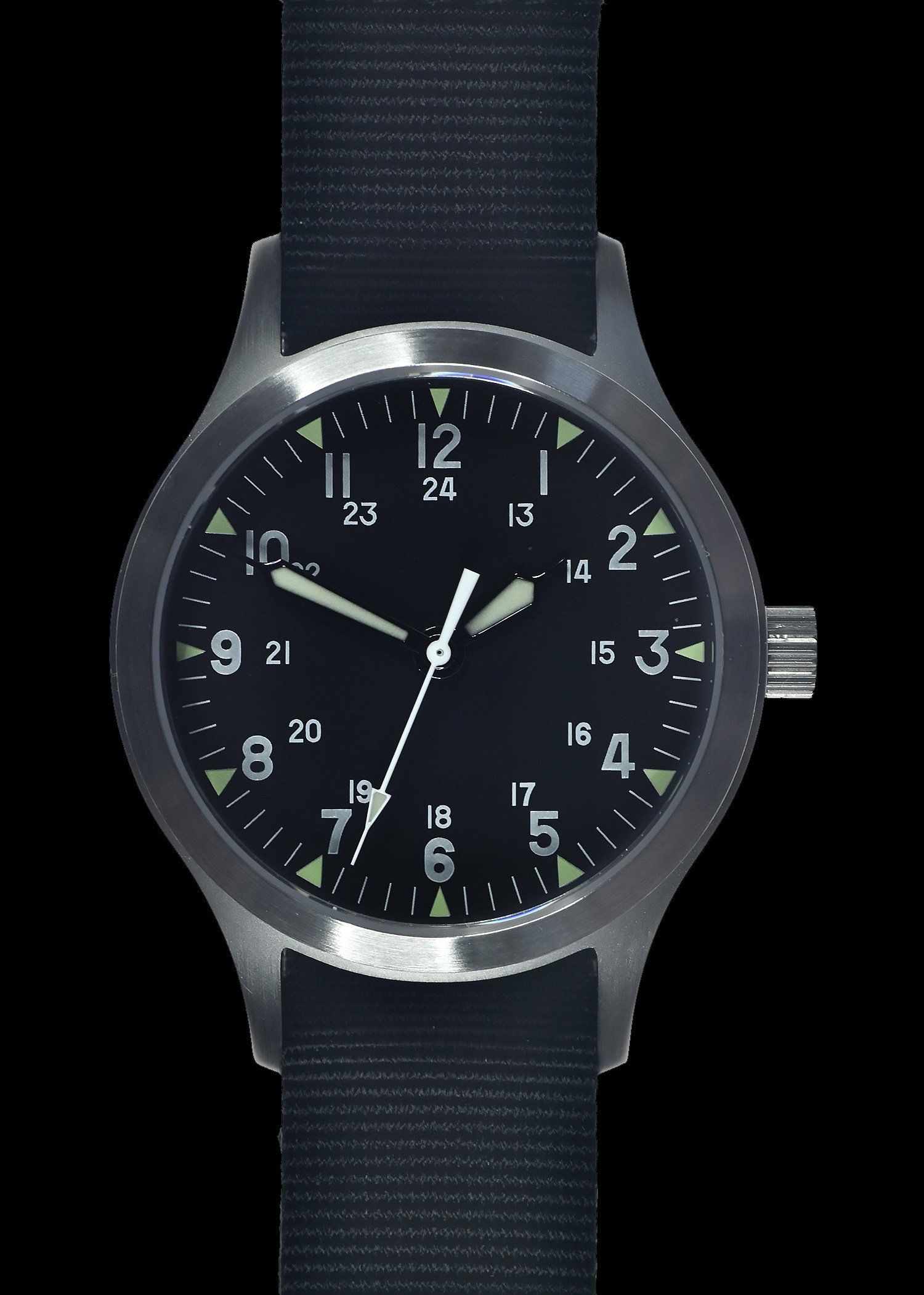 This MKIII variant is identical to the MKIII/AU/SS/1224 except it has both an unbranded dial and caseback (making it ideal for engraving with a service number or other details) which is a feature a lot of MWC clients regularly request. The MKIII automatic is a recreation of the classic 1950s NATO specification watches which were made under UK Ministry of Defence reference 6B/346 Mk XI. Although it is very similar in style to the watches made at that time it offers greatly improved accuracy through the use of a modern 24 jewel Automatic movement with 41 hour power reserve and hacking function