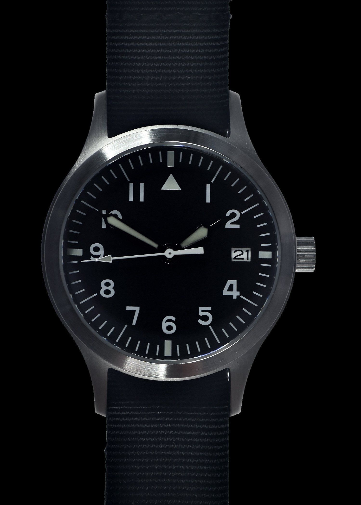 The reality is that with the budgetary constraints no modern military forces could afford watches of this quality when cheaper models can meet the need. In the past the worlds forces regularly purchased Rolex, IWC, Omega, Longines and various other well known makes. Unfortunatately those days are well gone. Because many people still want a military type watch that looks right even though it is made to a much higher specification we offer the MKIII. No expense has been spared to create a superior quality product from the high performance movement to the brushed stainless steel 1950/60s design case which is manufactured and handfinished in Zurich, the model was also upgraded recently with a scratch and shatter resistant sapphire crystal with non reflective coating.