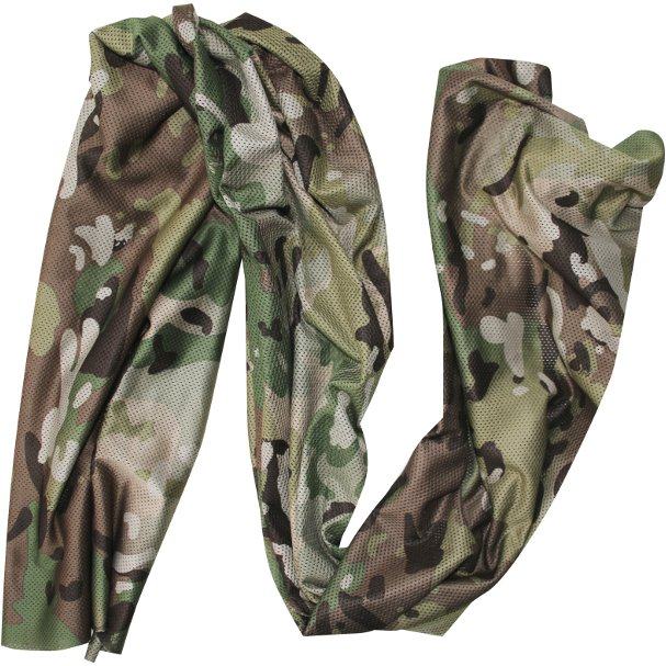 This scarf can be worn around the neck and head. The breathable mesh material can be seen through by the user but also acts as concealment from others. Camouflaged on both sides.