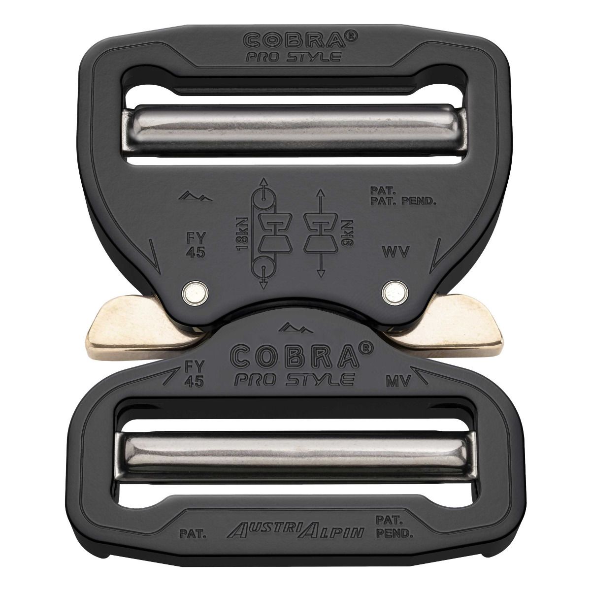 The COBRA® PRO STYLE is the strongest and world leading safety buckle made of aluminium. Thanks to its patented locking mechanism and high breaking strength it meets the highest safety requirements. In combination with a fitting webbing, the minimum guaranteed load capacity is 9 kN tensile strength and 18 kN in loop configuration.