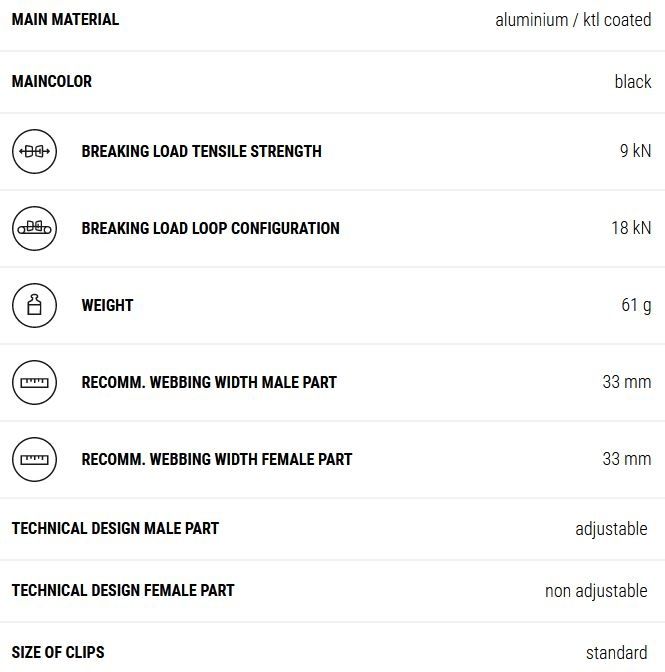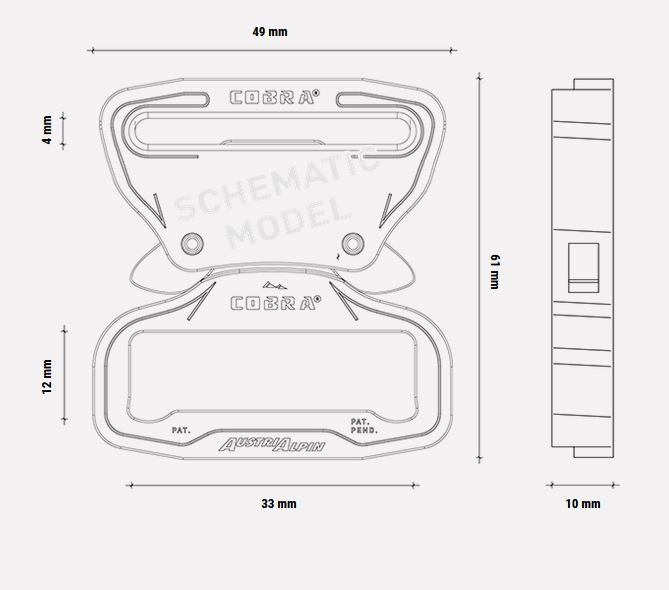 AustriAlpin Cobra Buckle is a patented Buckle that is reportedly the only side quick release buckle that will not open accidentally by either human or mechanical error when under load. Patent Protected Design and Engineering * 18kN or 4000lb (loop configuration) / 9kN or 2000lb (direct load) * Lightweight 7075 aluminum alloy * CNC machined (not forged) for perfect consistency and flawless operation * Precise action brass release mechanism