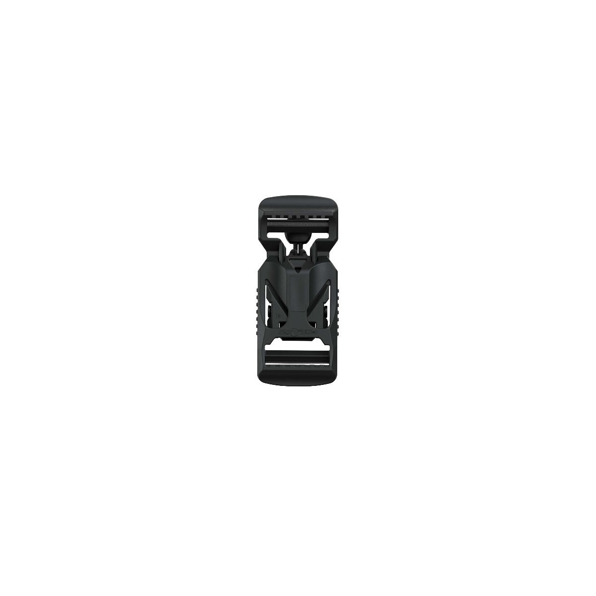 The V-BUCKLE 25 LL black flap + pull tab features two ladderlocks, offering adjustable attachment of webbing on both sides of the buckle. This version was designed with a black stainless steel flap.