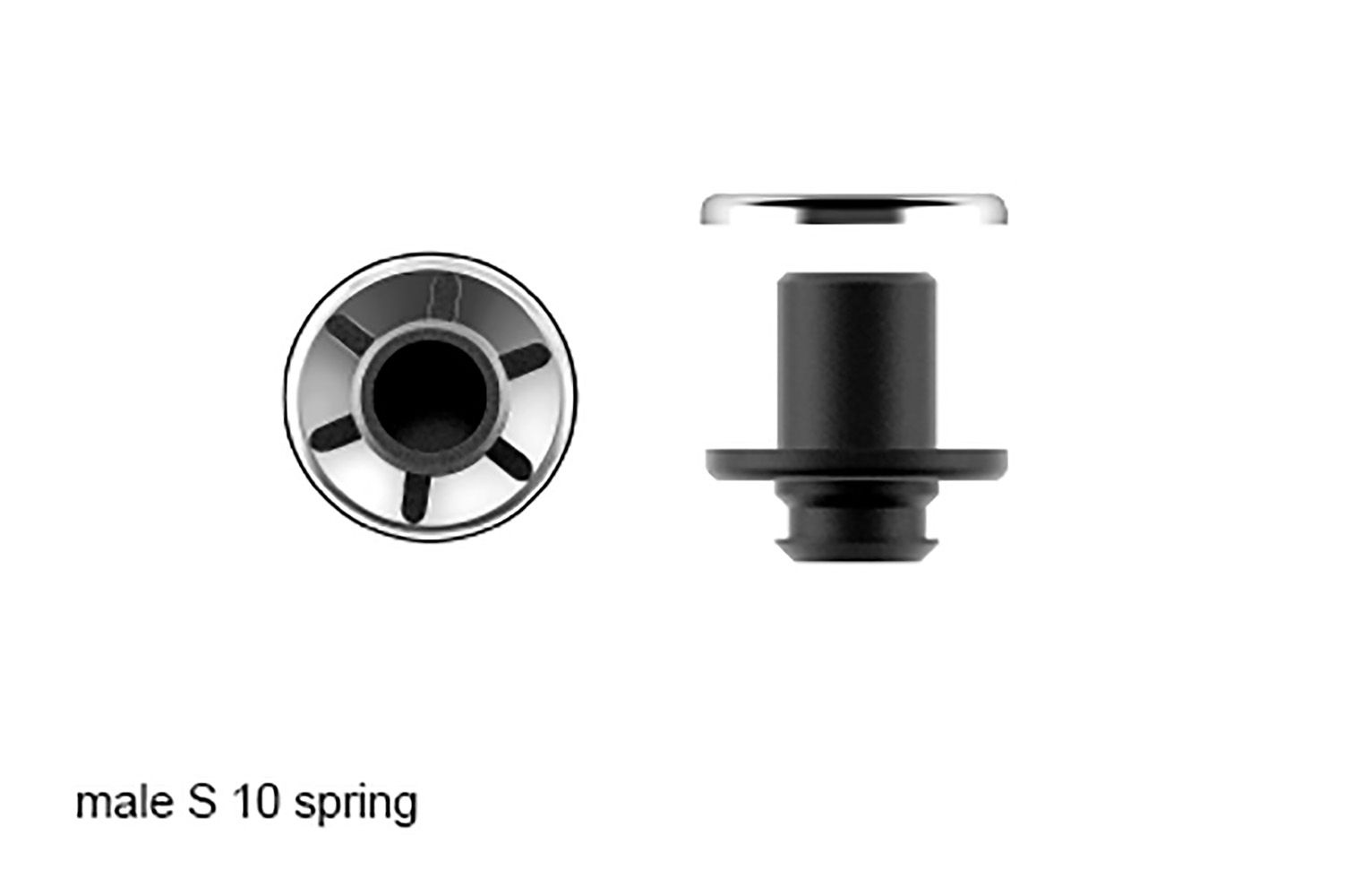 The SNAP male S 10 spring features a 10 mm long, cylindrical stem onto which an axle clamp ring is pressed (press required), allowing concealed fitting. This upper part (male) is compatible with all SNAP female S lower parts.