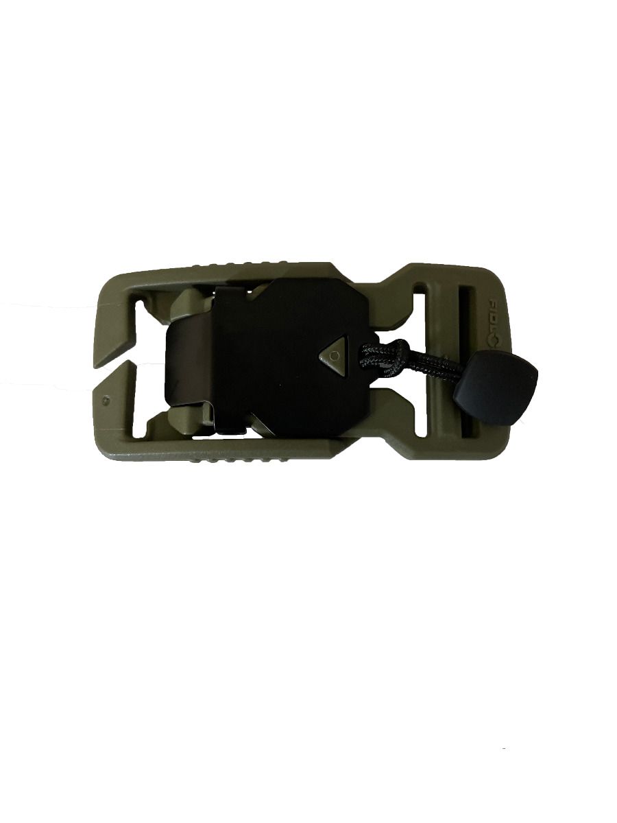 Military Oive Fidlock Buckle. Due to the split bar this fastener can be retrofitted, even by the end customer, making this ideal as a premium option to give a bag a certain added extra. Even on the production side this fastener offers simple retrofitted assembly.