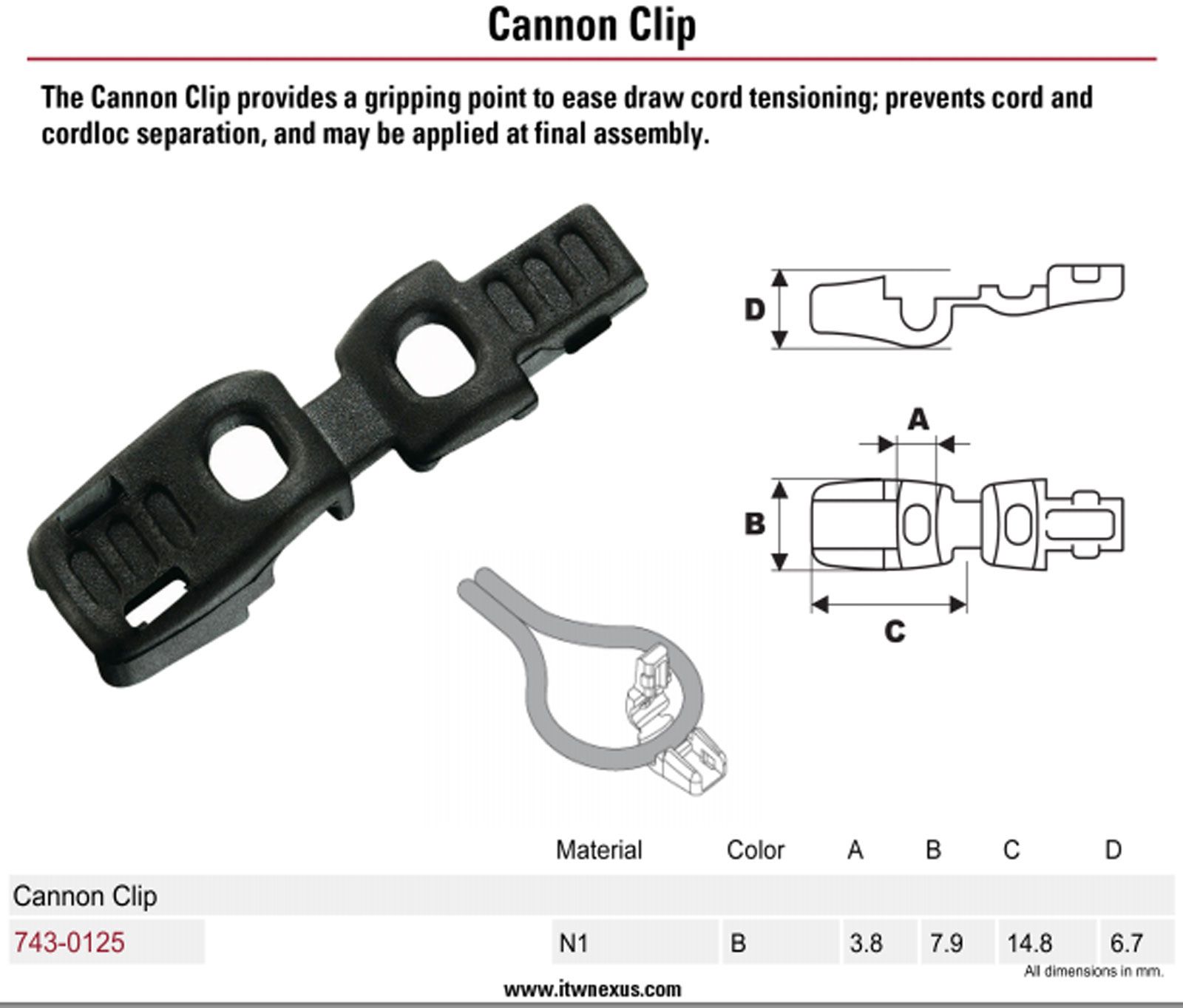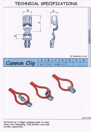 The Cannon Clip provides a finger gripping point to ease draw cord tensioning; prevents cord and cordloc separation, and may be applied at final assembly.