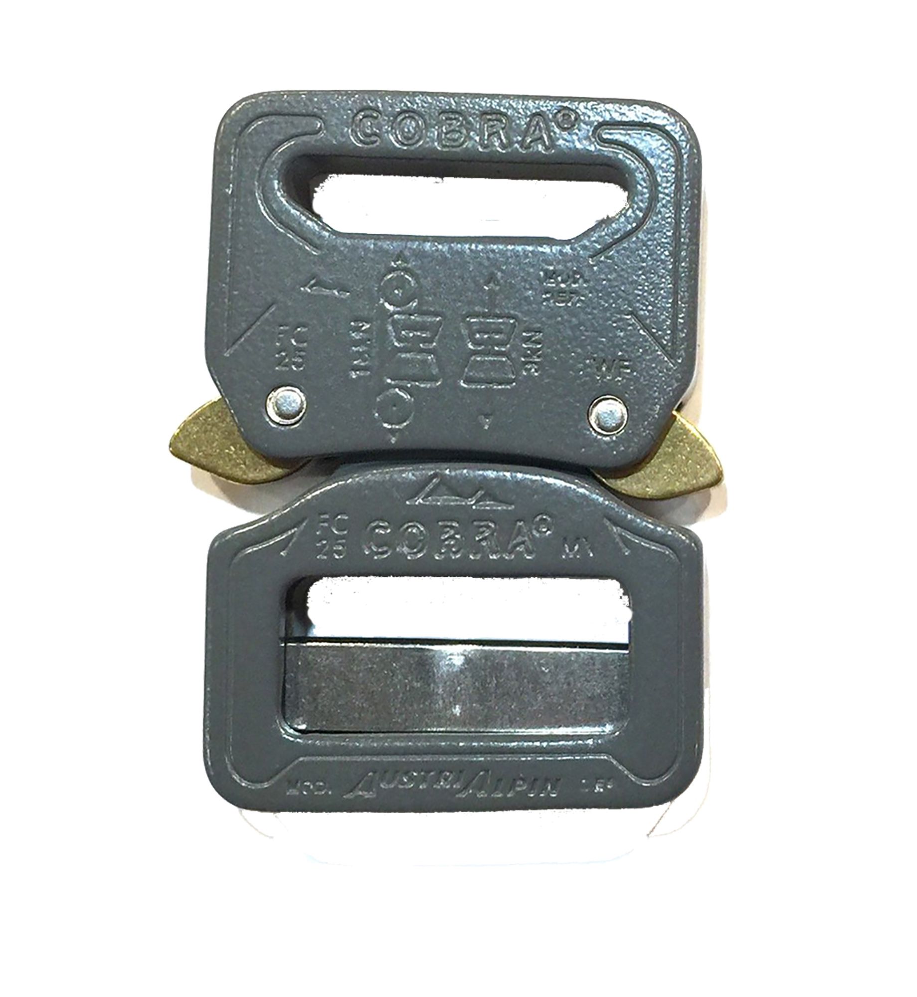 AustriAlpin Cobra Buckle is a patented Buckle that is reportedly the only side quick release buckle that will not open accidentally by either human or mechanical error when under load. Patent Protected Design and Engineering * 18kN or 4000lb (loop configuration) / 9kN or 2000lb (direct load) * Lightweight 7075 aluminum alloy * CNC machined (not forged) for perfect consistency and flawless operation * Precise action brass release mechanism