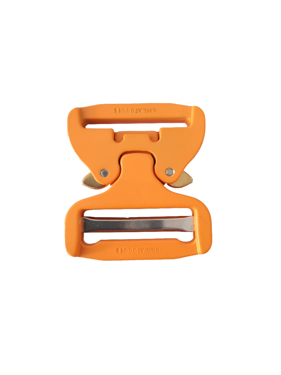The buckle is male adjustable, fixed female and a orange finish.