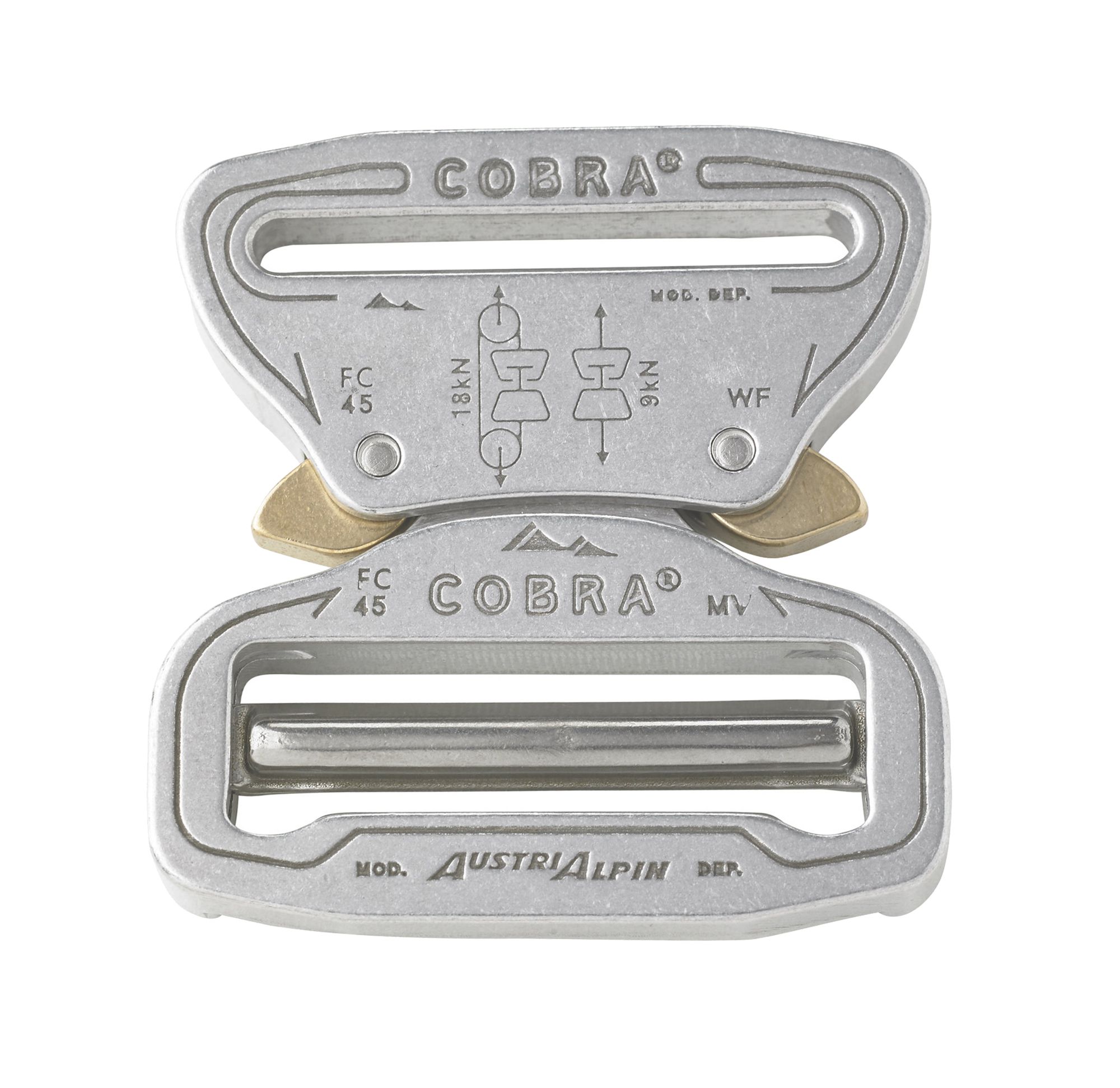 AustriAlpin Cobra Buckle is a patented Buckle that is reportedly the only side quick release buckle that will not open accidentally by either human or mechanical error when under load. Patent Protected Design and Engineering * 18kN or 4000lb (loop configuration) / 9kN or 2000lb (direct load) * Lightweight 7075 aluminum alloy * CNC machined (not forged) for perfect consistency and flawless operation * Precise action brass release mechanism