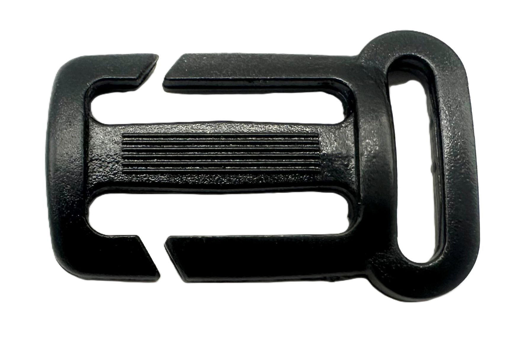 The vertical split-bar section is designed to attach to 25mm (1-inch) webbing, while the smaller horizontal fixed slot accommodates 20mm (3/4-inch) sternum straps. Thanks to the orientation of the slots, this buckle can also be used with various other strap configurations.