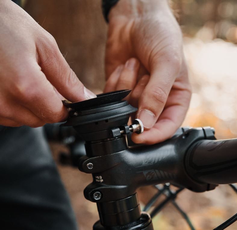 The ahead cap mount consists of a special ahead cap which is screwed to the head tube. The base is then placed on the cap and is easily secured with a clamp using a knurled screw, or theft-proof with an Allen screw. The ahead cap base can thus be quickly removed when no smartphone is needed, while the plain cap remains screwed to the bike.