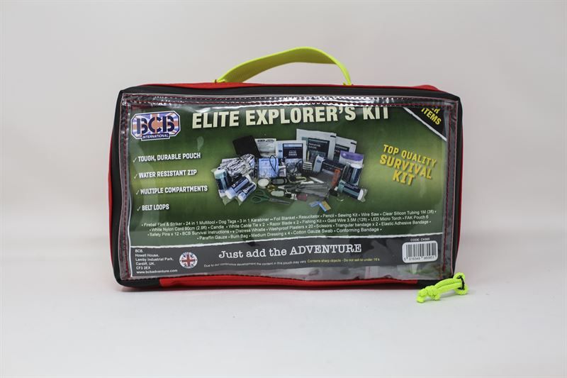Elite Explorer's Kit - 32 Piece Kit the ultimate survival kit for the elite explorer! Jam packed with tools, medical, fire lighting and emergency signalling items. All packed inside our large vibrant red 500D nylon pouch with a waterproof resistant zip to keep your gear protected, which has an easy to find, hi visibility pull-tab.