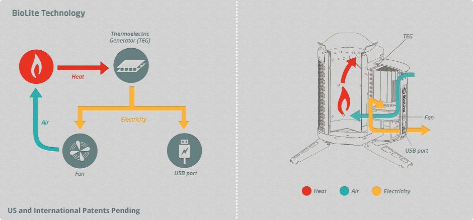 Using BioLite's patent-pending thermoelectric technology, BioLite Stoves convert heat to electricity that powers a fan to make the fire ultra-efficient.