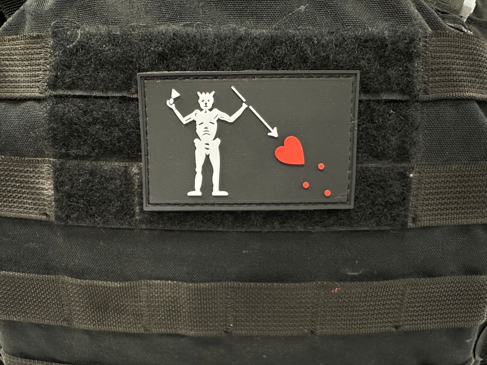 Blackbeard Pirate Flag PVC Patch with Velcro backing. Measures approximately 5cm x 8cm (2" x 3"). Perfect for tactical gear, jackets, bags, and more.