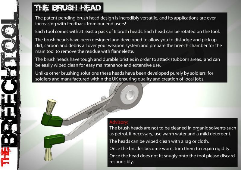 *Results summarise that one brush head will last a week on an average plt commanders course in Brecon. On “Particularly filthy weapons including the LMG”.