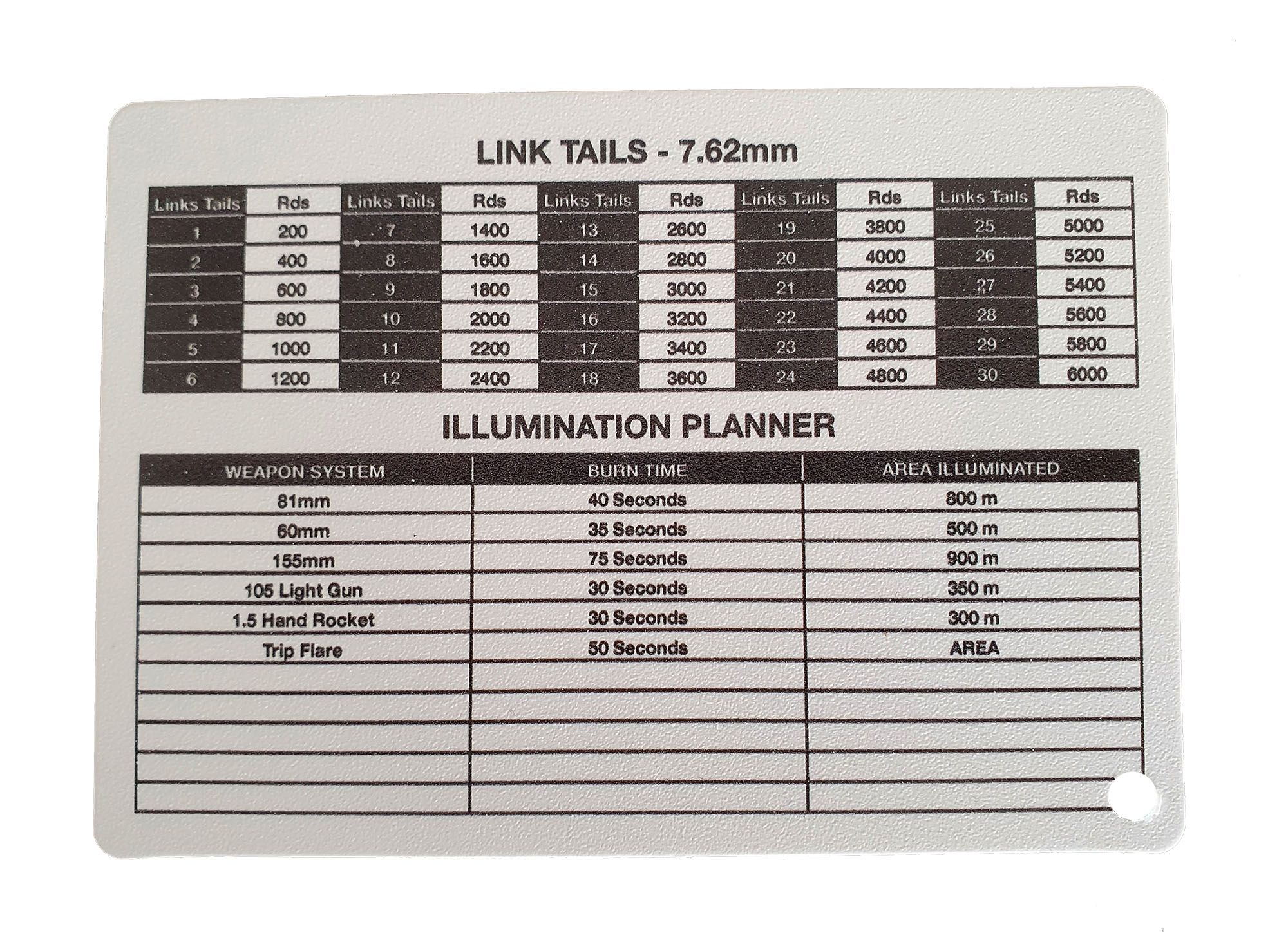 Double Sided including all relevant information needed with one side having full conversions for upto 100 magazines. Reverse includes Link Tails and Illumination Planner.