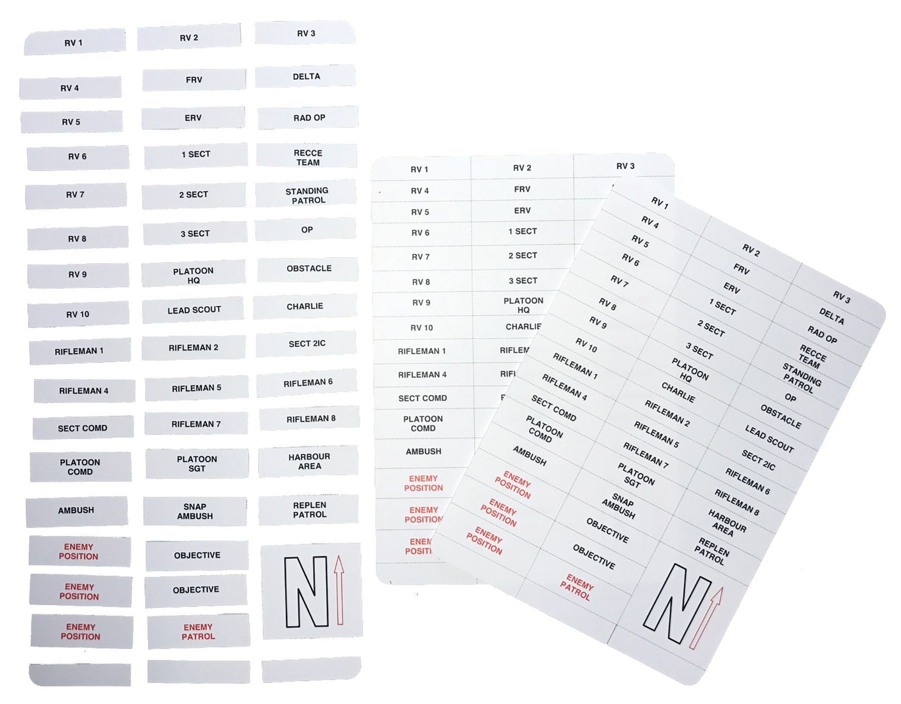 3. 20 x Model Kit Markers. 5 x Red, 5 x White, 5 x Green, 5 x Yellow. Measuring 13.5cm in height and a surface area to write on of 5.5cm by 3.5cm. The flat surface area allows you to write in large letters the symbol you require on both sides allowing you read it at the same time as the on looking troops. These markers are sturdy and will far outlast the small cheap ones. Easy to read, no bending sideways. Can be written on using pencil or marker pen