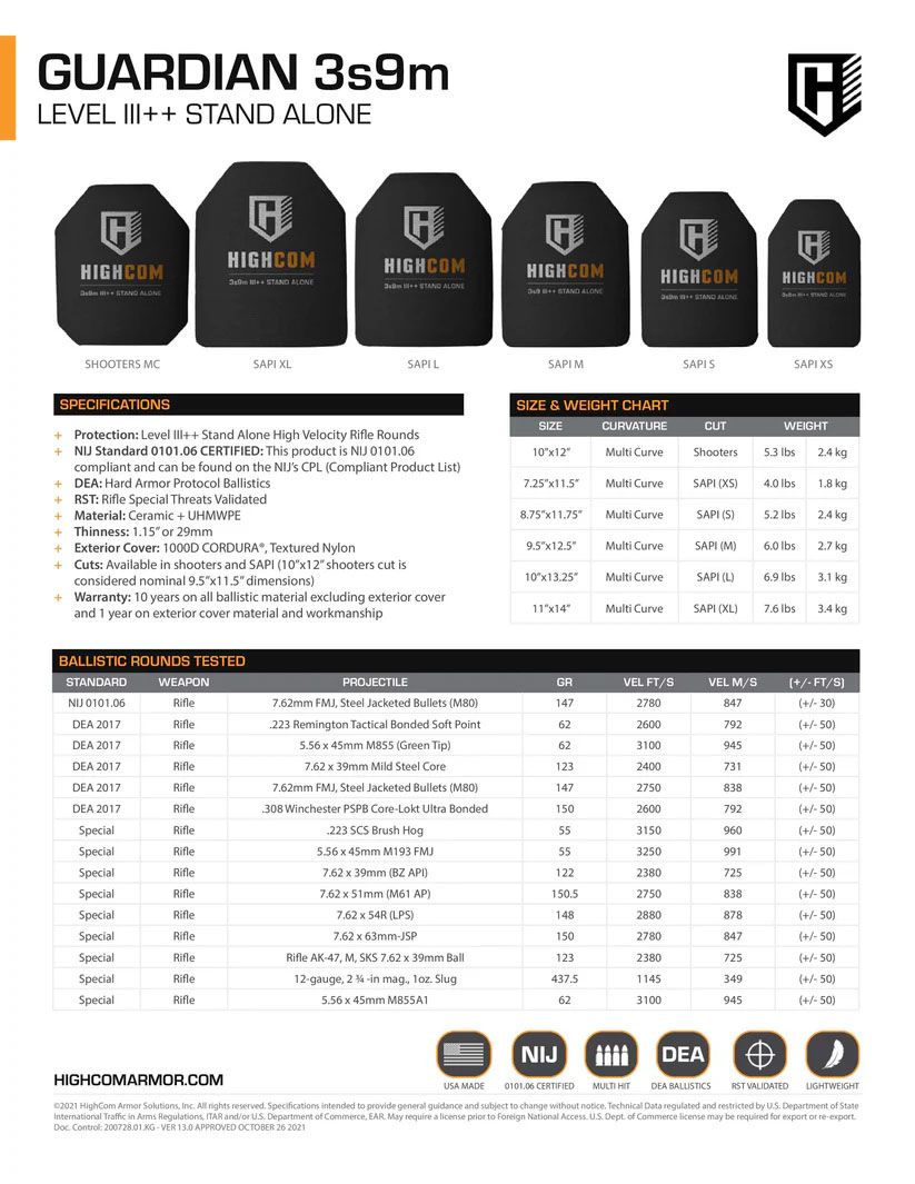 The Highcom Guardian 3s9m is a lightweight, high performance level 3+ NIJ certified plate that provides near level 4 (Armour piercing) protection. The Highcom 3s9m is an excelent option for anyone looking for a NIJ Certified plate with a high level of protection, without the heavier weight of a level 4 plate, or the high cost of a lightweight level 4 plate.