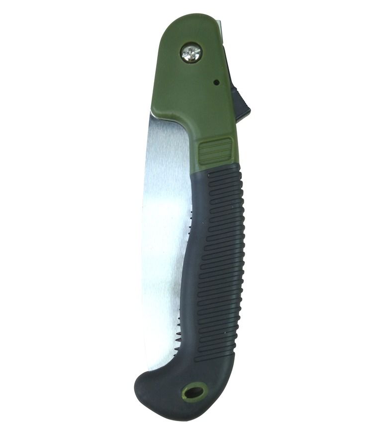 A large folding saw with jagged edge for cutting green and dead wood with ease.