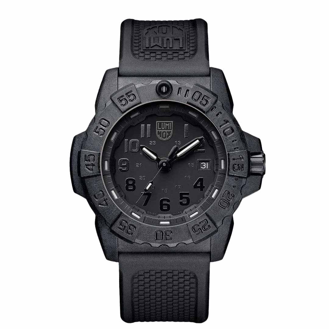The Luminox Navy SEAL 3500 Blackout is a rugged tactical watch featuring a bold 45mm CARBONOX™ case, black-on-black dial, and durable PU black strap. Designed for performance in extreme conditions, it includes a unidirectional dive bezel and is water-resistant up to 200 meters, making it ideal for diving and military use.
