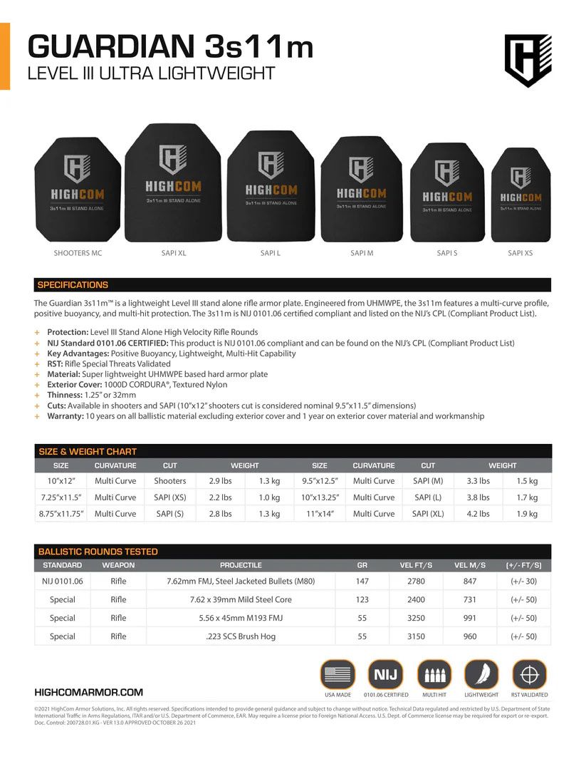The Highcom Guardian 3s11m is a ultra lightweight NIJ certified level 3 standalone plate.