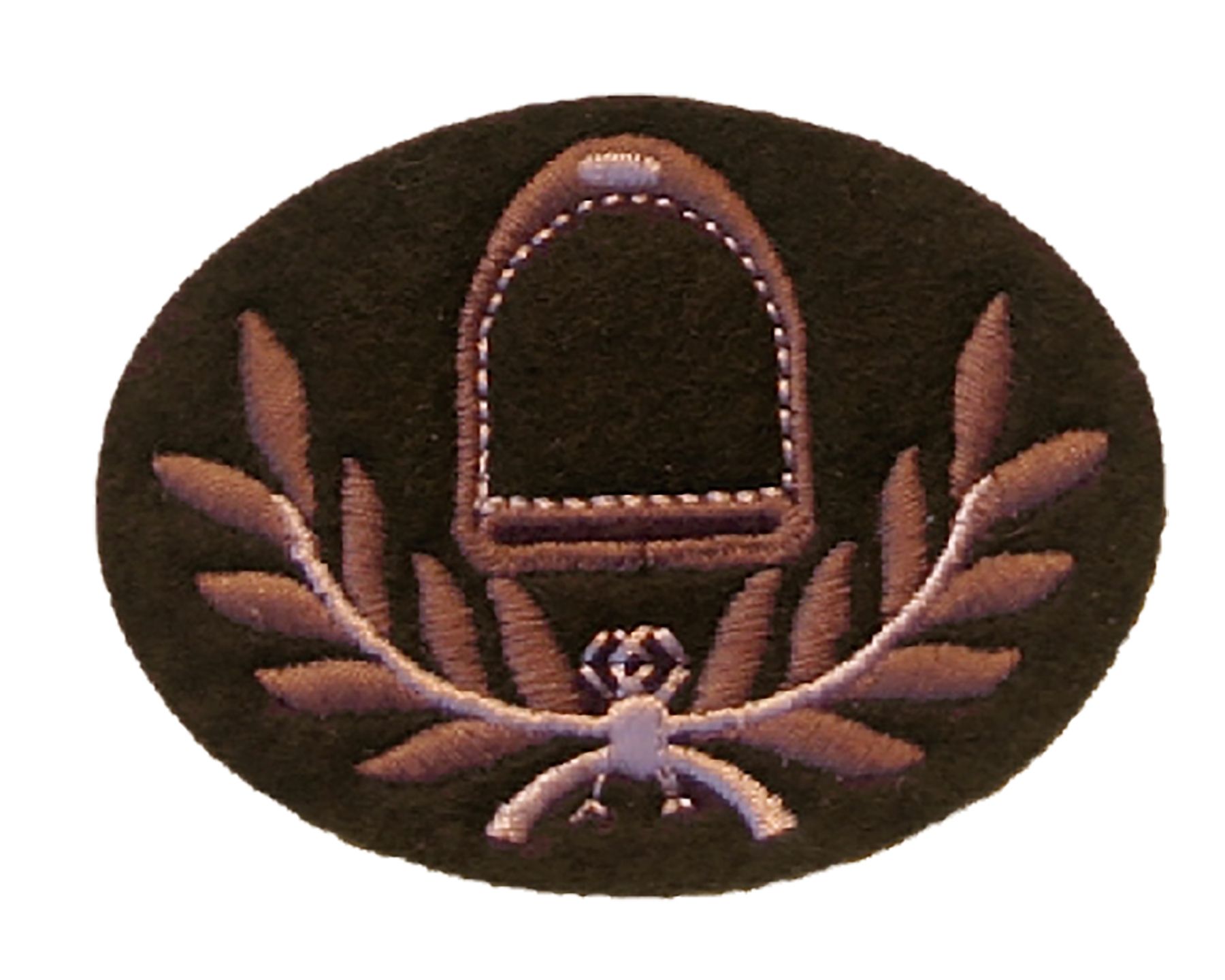 Official Description: Badge, Qualification. Mounted Duty Class 3. Cloth. Embroidered. Brown stirrup withbrown/white laurel wreath underneath. Sew on type. Oval shape. 5cm wide.