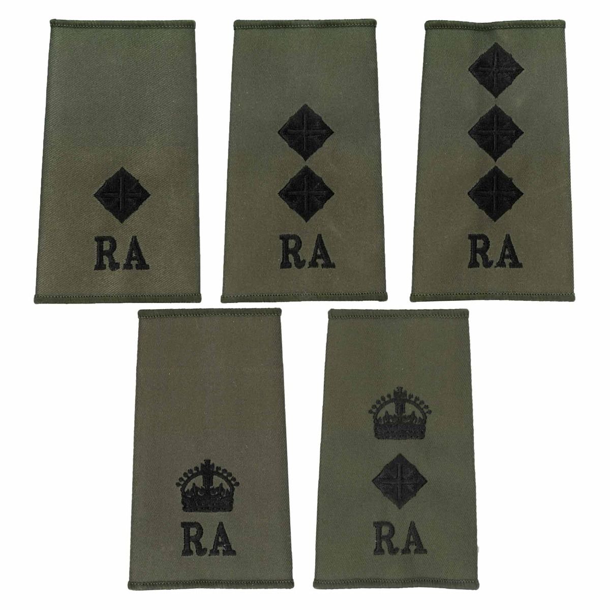 Royal Artillery (RA) olive green rank slide featuring high-quality embroidered black insignia. These authentic British Army epaulettes are designed for durability and accuracy, making them suitable for serving personnel, cadet forces, military collectors, or re-enactors. Each slide displays the distinctive RA lettering and rank symbols, covering a range of ranks within the Royal Artillery. Ideal for completing a uniform, training purposes, or as part of a military insignia collection.