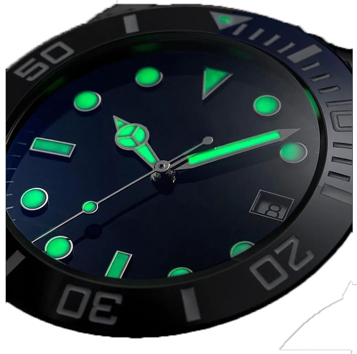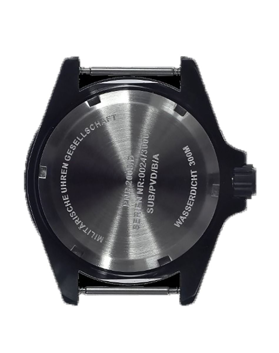 The special covert matt black non-reflective PVD finish used for this watch is often specified in military contracts for many special forces units as well as by anti-terrorist units and for various covert operations. In the PVD process, the steel is not black all the way through because the colour is created by a special chemical PVD plating process which is vastly superior to the painted finish used on some lower quality watches which can easily fade or rub off. This PVD process means that the colour of the steel is altered at a molecular level, therefore it will not deteriorate even during heavy usage although it can be destroyed if the case is badly damaged by a piece of metal being gouged out or if the case is worn down by continuous heavy abrasion against rocks etc.