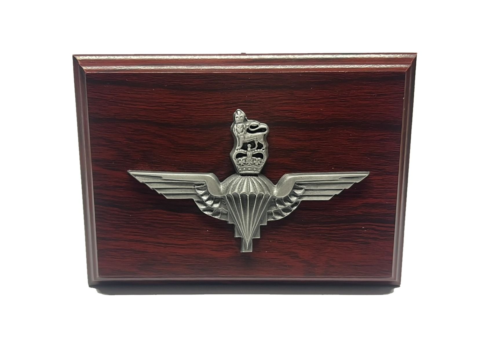 This elegant varnished wooden plaque features a single, highly detailed pewter Parachute Regiment cap badge, making it a refined tribute to the Parachute Regiment. Measuring 6" x 4", its minimalist design highlights the iconic cap badge, creating a striking focal point.