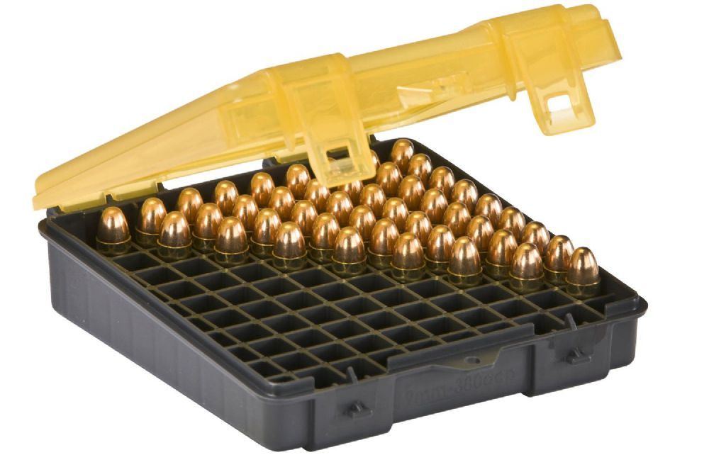 Sturdy hard plastic case for holding 100 rounds of pistol ammunition.