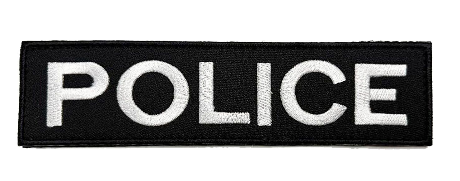 Large professional "POLICE" patch measuring 20cm x 5cm with Velcro backing. Ideal for tactical vests, outerwear, and gear requiring bold, visible identification.