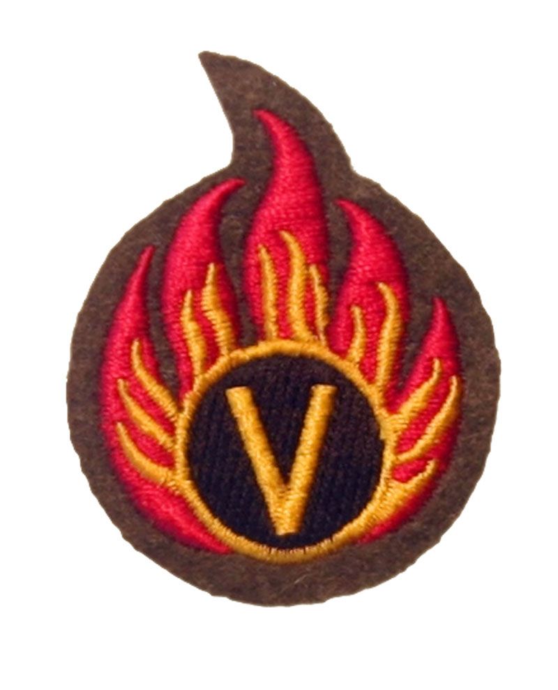 Official Description: Badge Qualification. Army. Ammunition Technician. Cloth. Embroidered. Yellow on khaki. "V"in circle, with flames.