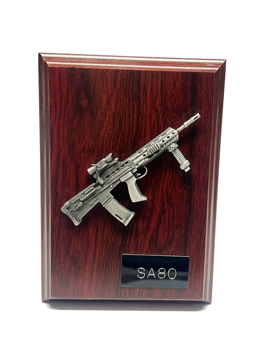 This varnished wooden plaque showcases a highly detailed pewter SA80 rifle, symbolizing the standard issue weapon of the British Armed Forces. Measuring 6" x 4", the plaque's clean and simple design highlights the iconic SA80, making it a striking piece for collectors and enthusiasts alike.