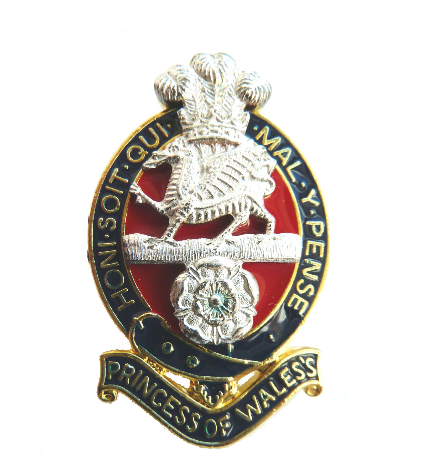 Official Description: Insignia, Service Cap. Princess of Wales's Royal Regiment. Officers: Gilding metal and nickel silver. Gilt and silver-plated. Red and blue enamel finish.