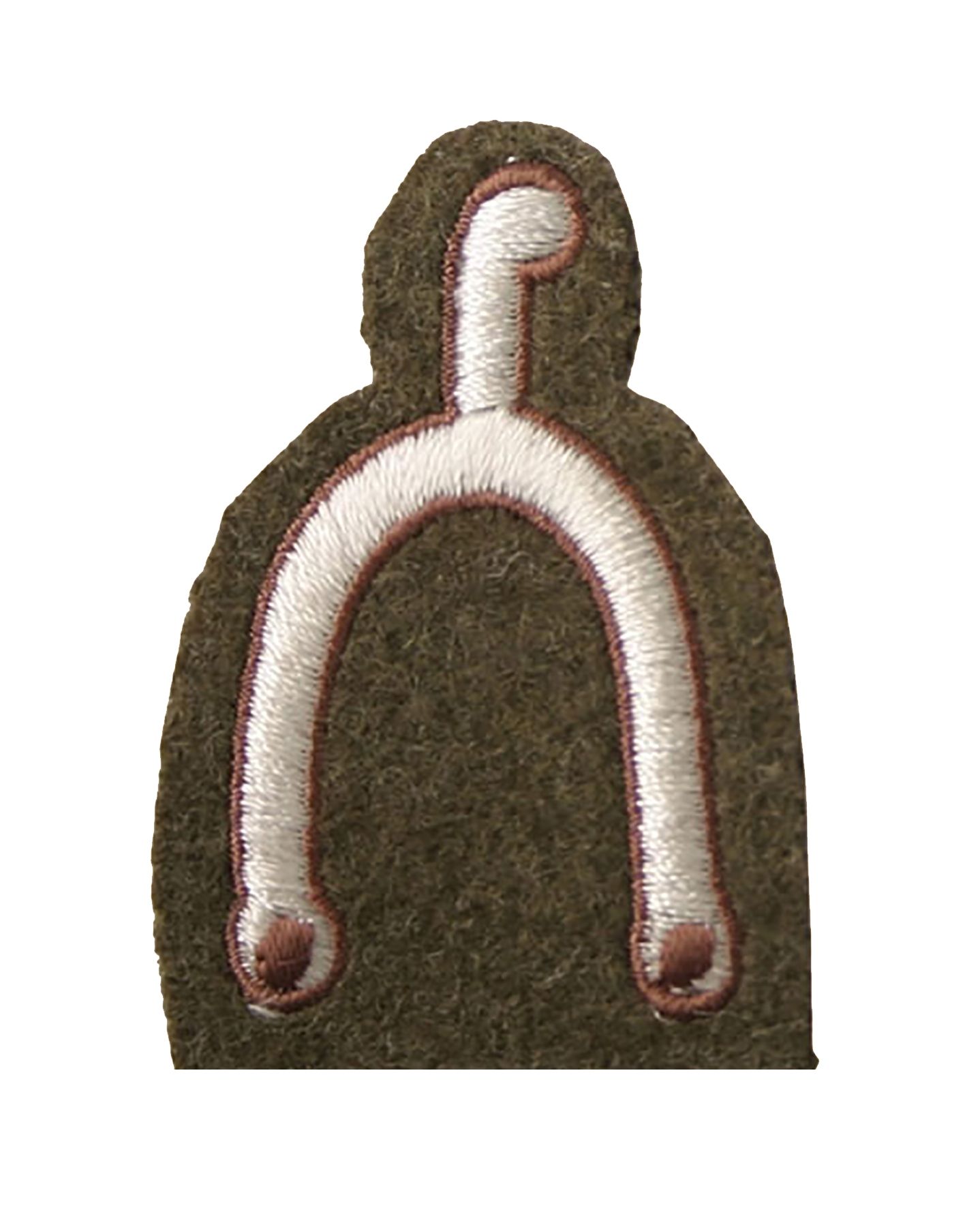 Description: Badge Qualification. Army. Riding Instructors. All Equitation Instructors. Cloth. Embroidered. White on khaki. Small. Spur.