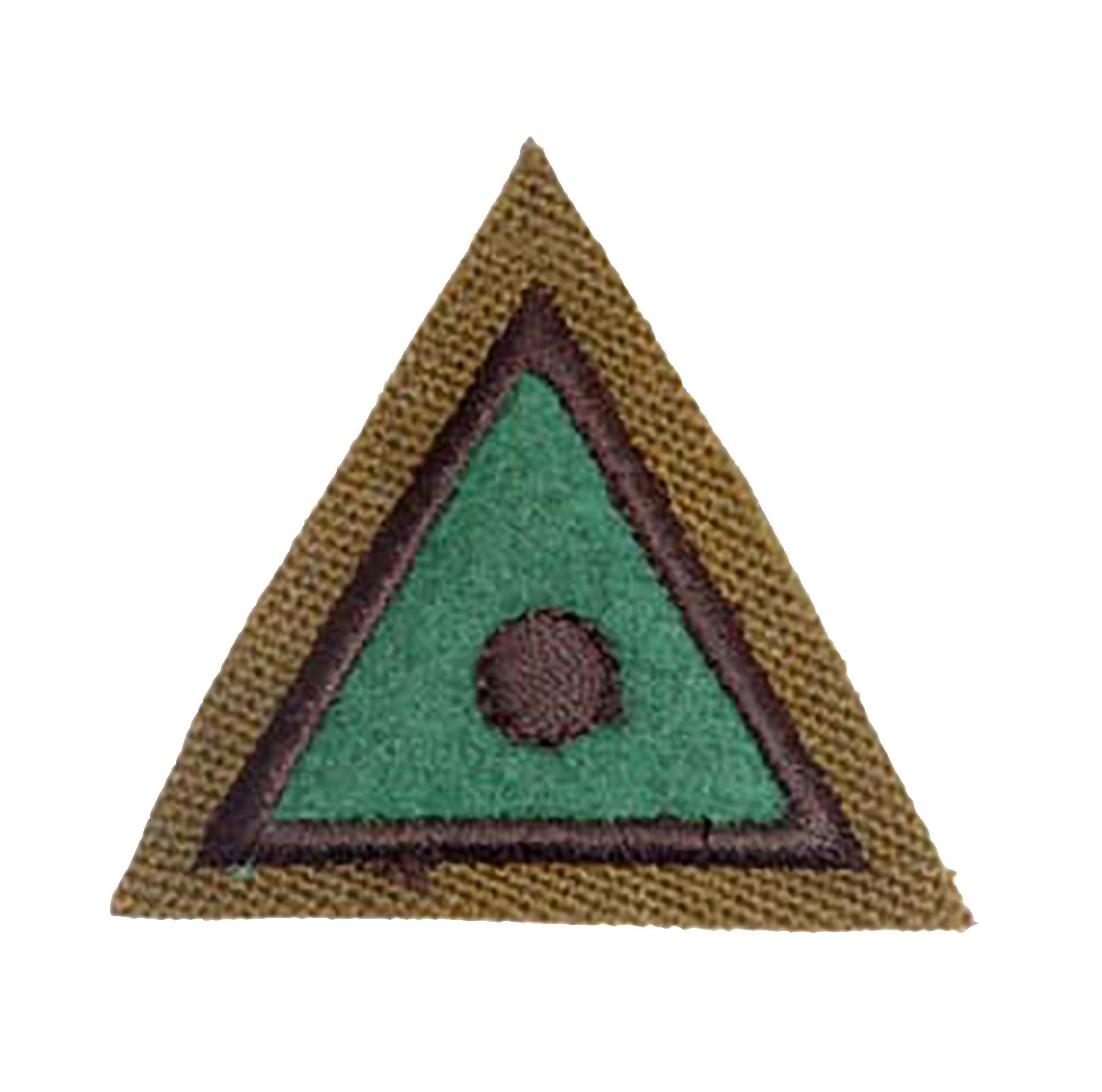 Description: Badge Qualification. Special Observer. Black and Green and Olive. 5 cm olive triangle with green melton triangle on top with black embroidered edging and small black circle in centre