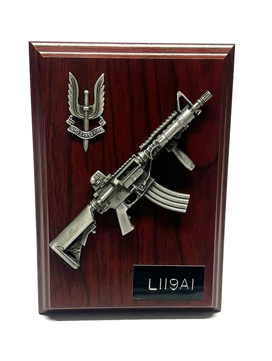 This plaque features an authentic SAS cap badge and weapon detail, both made from pewter and highly detailed.