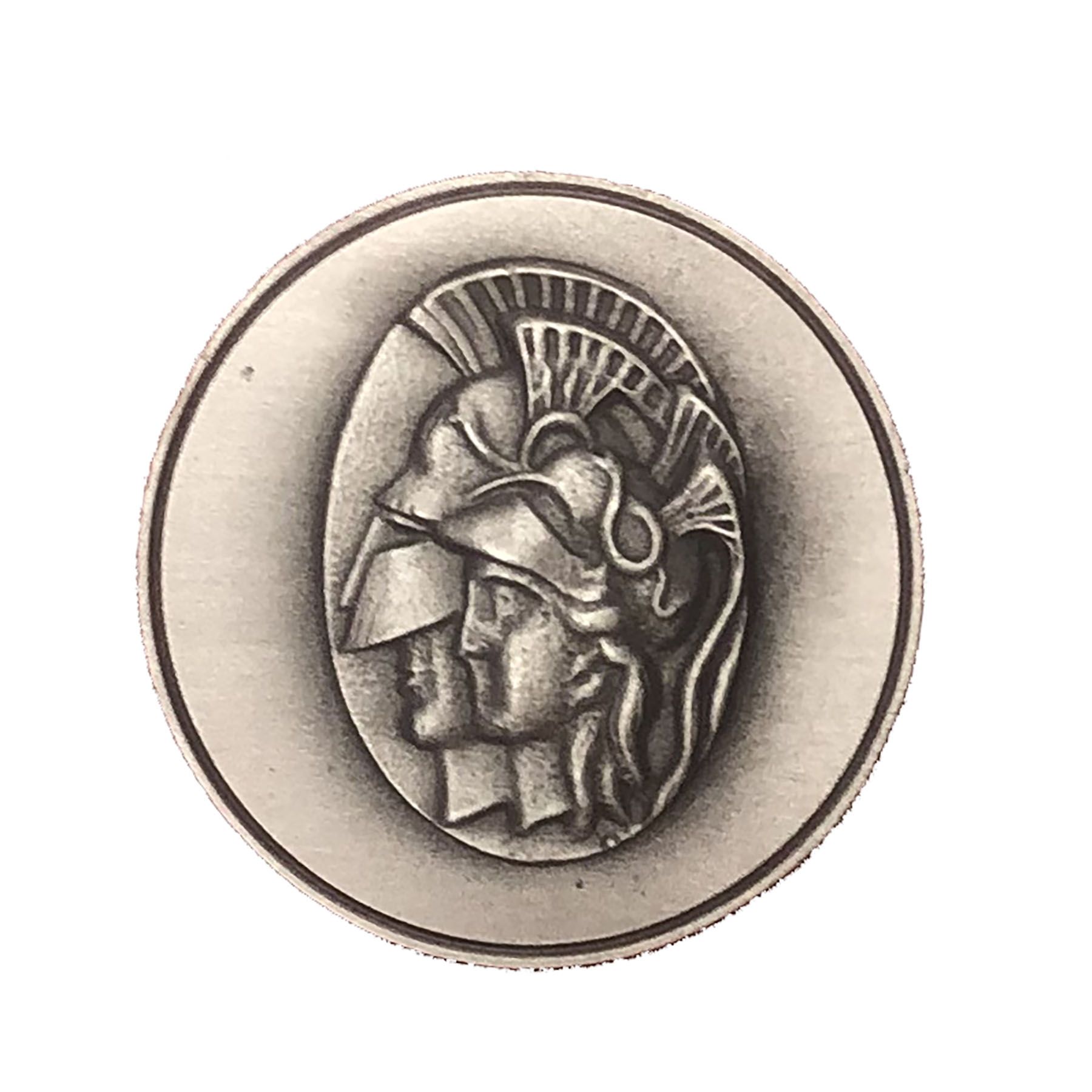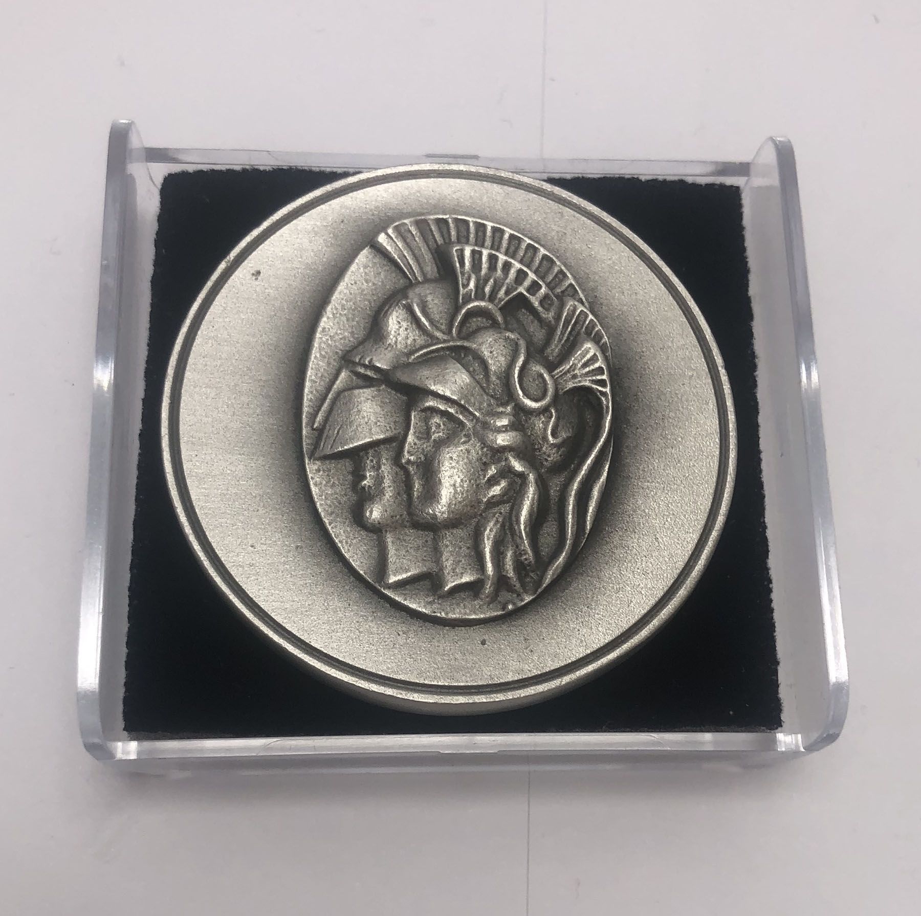 The reverse of the coin shows the heads of the Roman gods Mars and Minerva