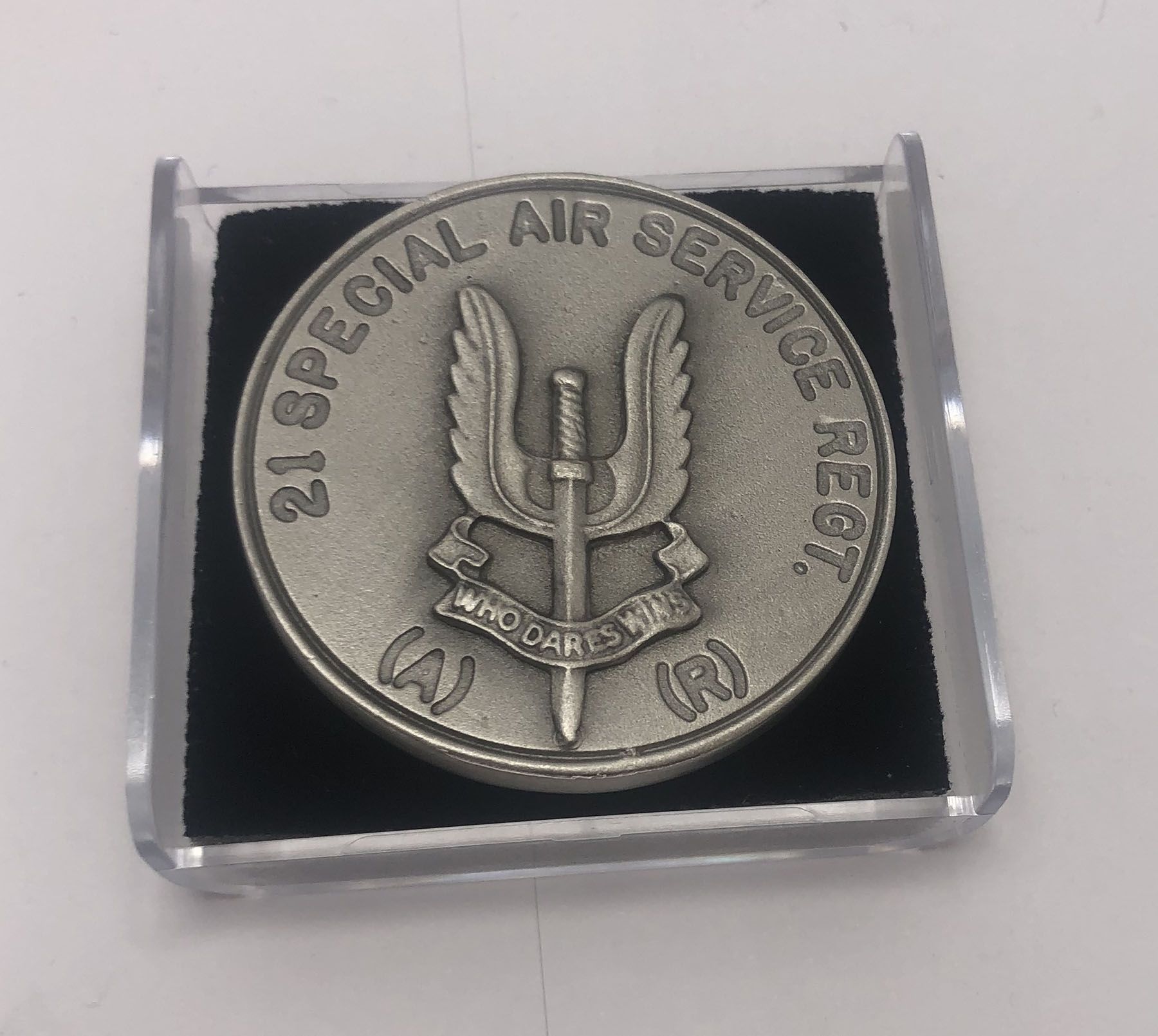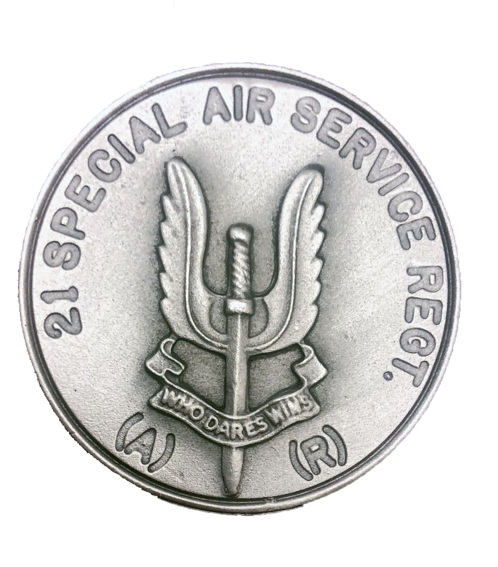 The coin has the regiments crest on it with "WHO DARES WINS" also around the edge of the coin on the front and has "21 SPECIAL AIR SERVICE REGT. "
