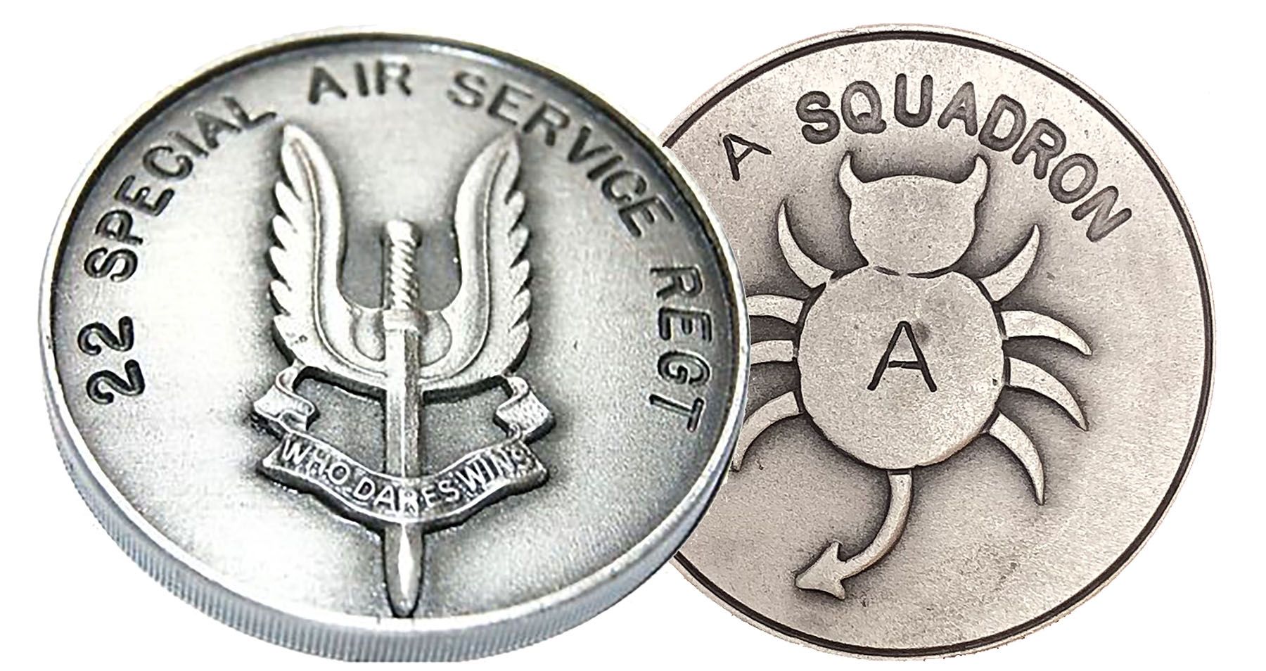 These coins are made from the original molds that made the coins that were sold and given away on the Special Air Services Camp in Hereford. There are not loads of these around however they were given to visiting dignitaries and those attached arms that served with the Squadron. Many members of the Squadron also bought them and gave them to friends and family.