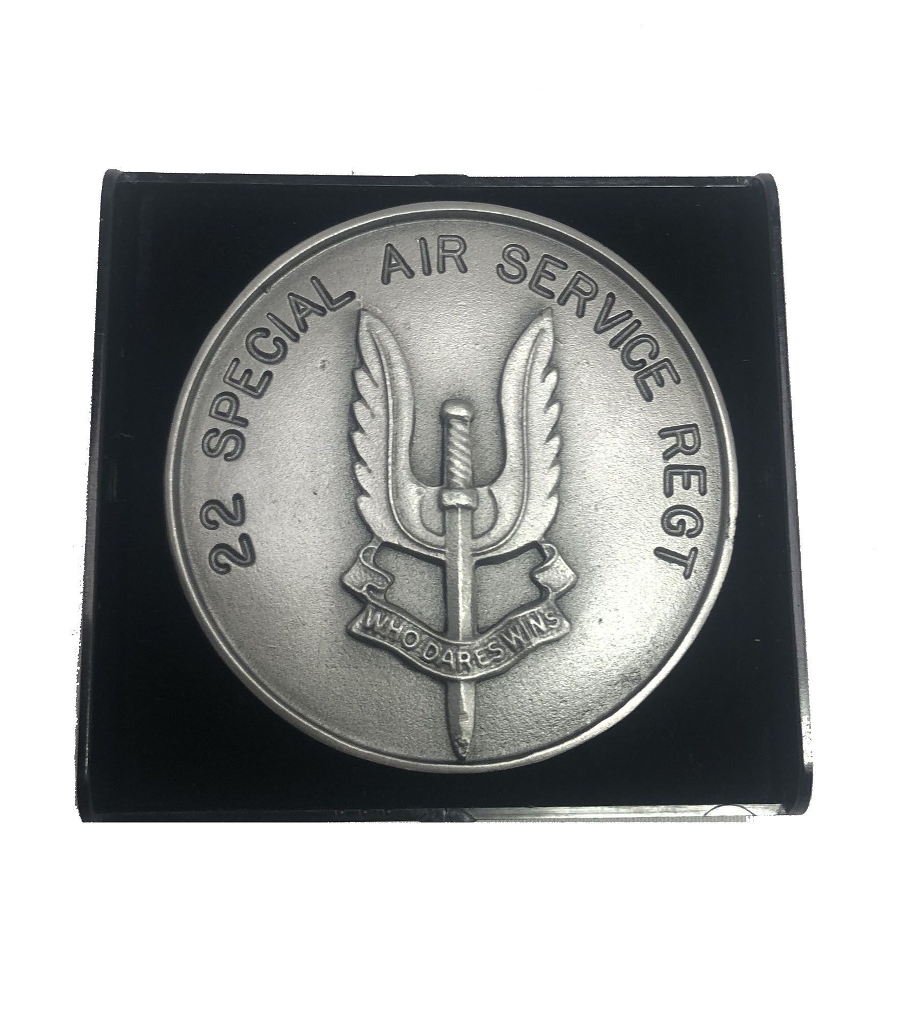 The coin has the regiments crest on it with "WHO DARES WINS" also around the edge of the coin on the front and has "22 SPECIAL AIR SERVICE REGT. "