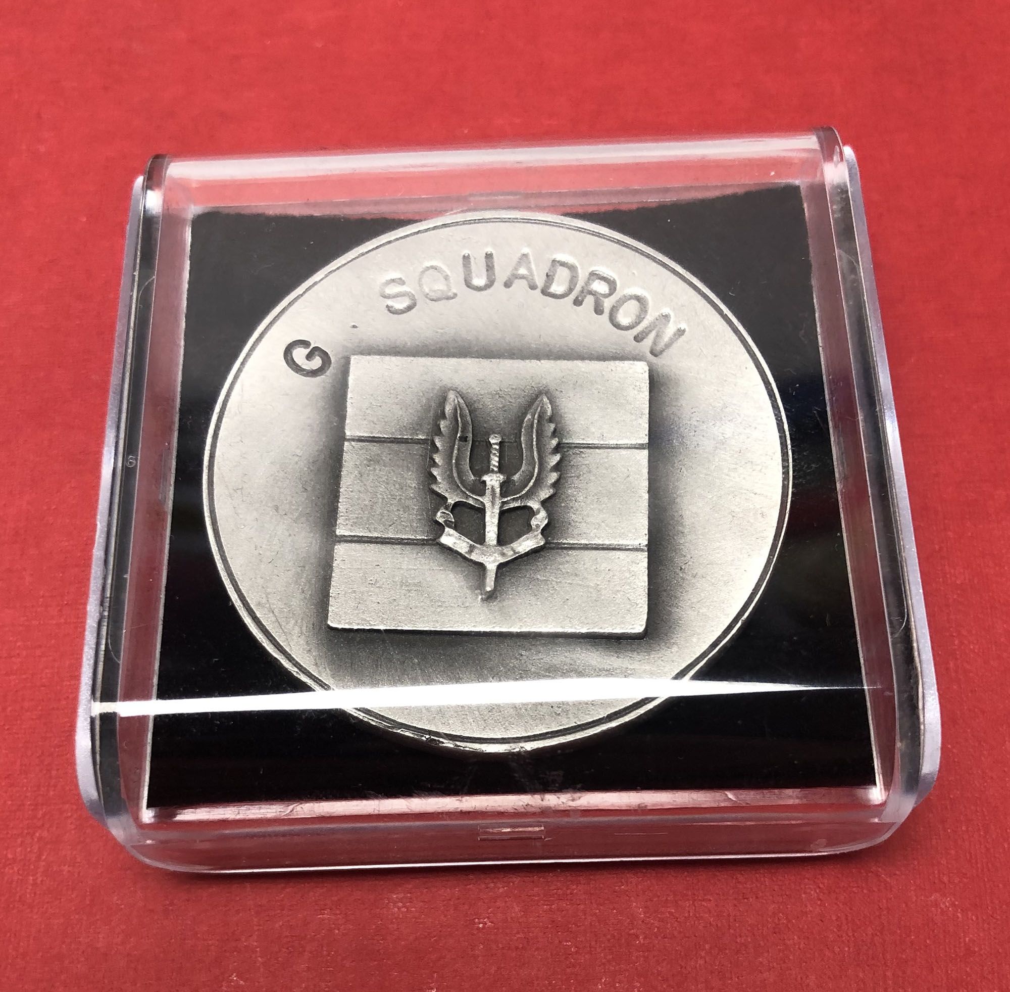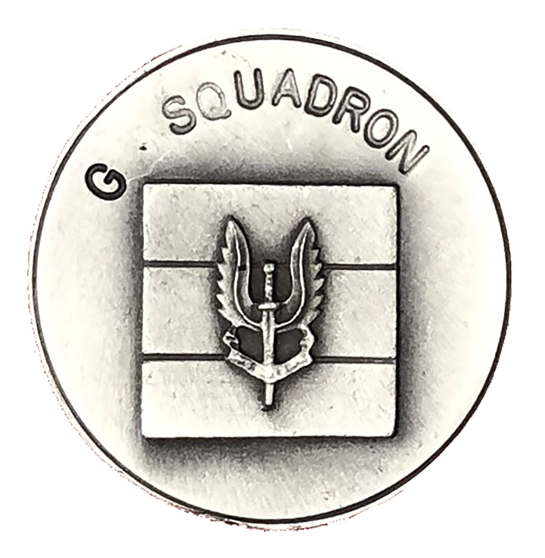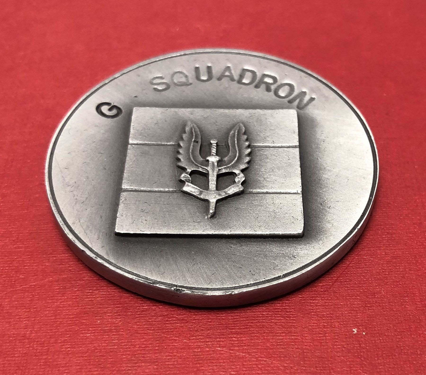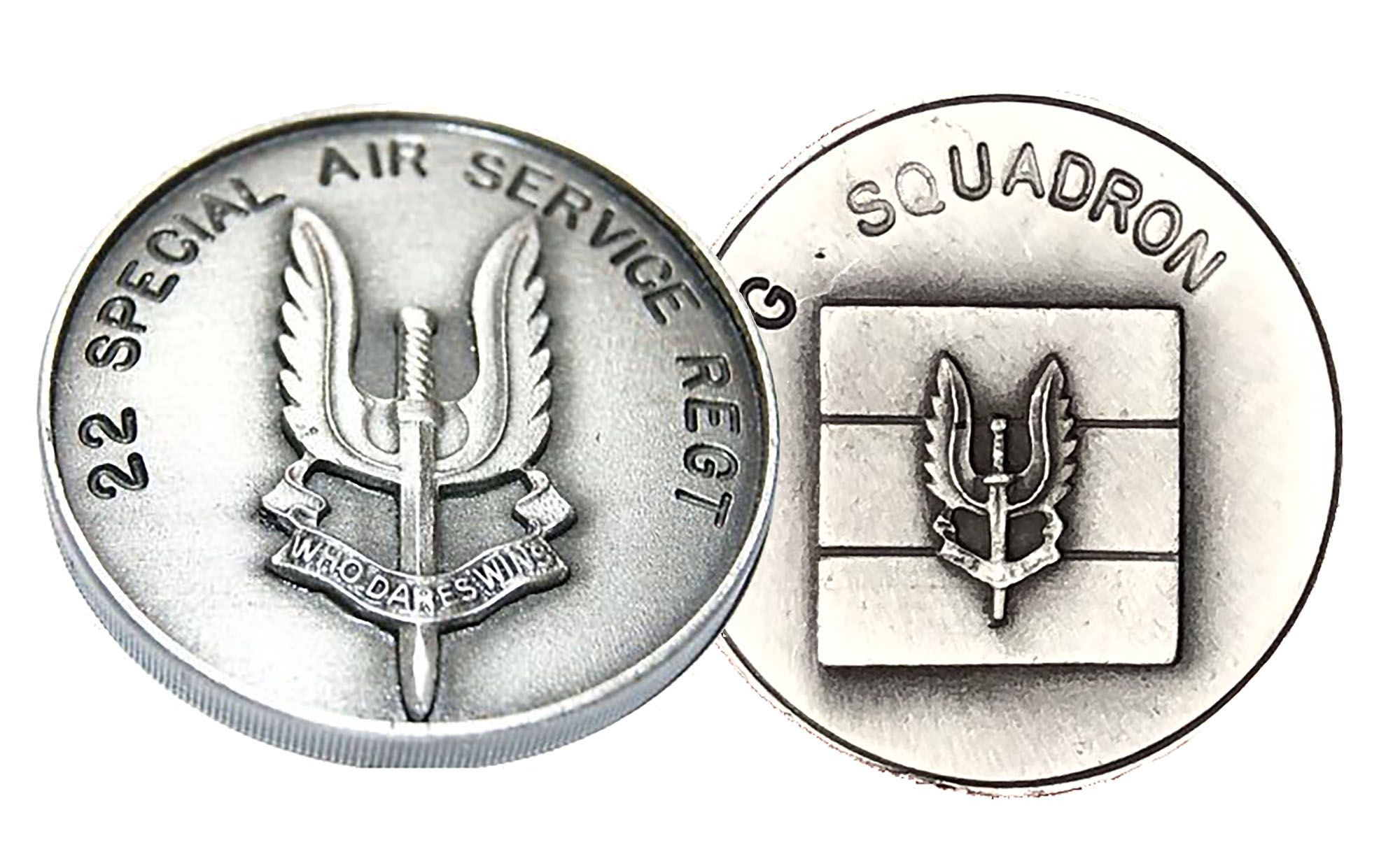 On the reverse of the coin has the SAS Cap Badge in small and a representation of the Blue Red Blue in Pewter for G Squadron