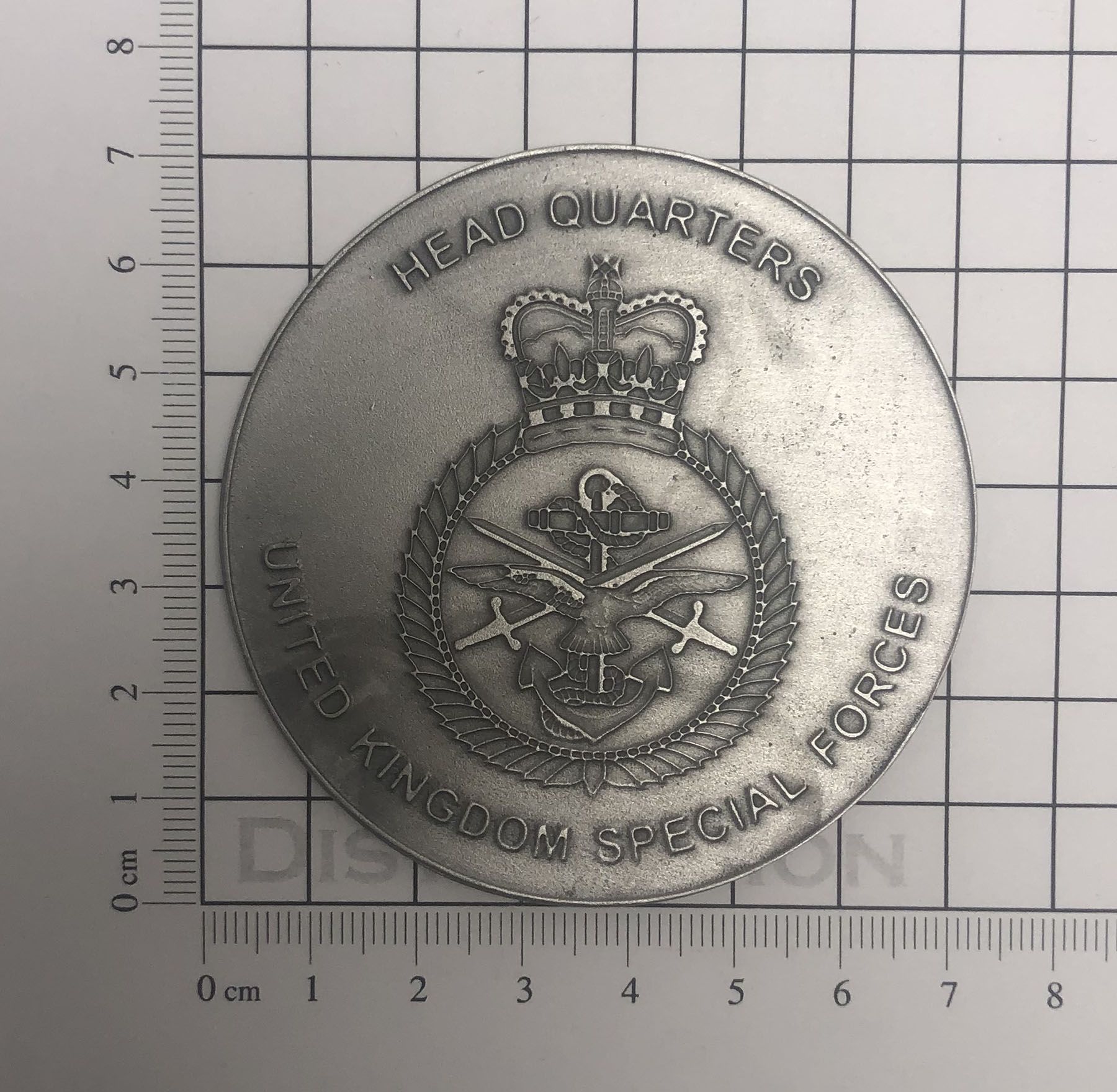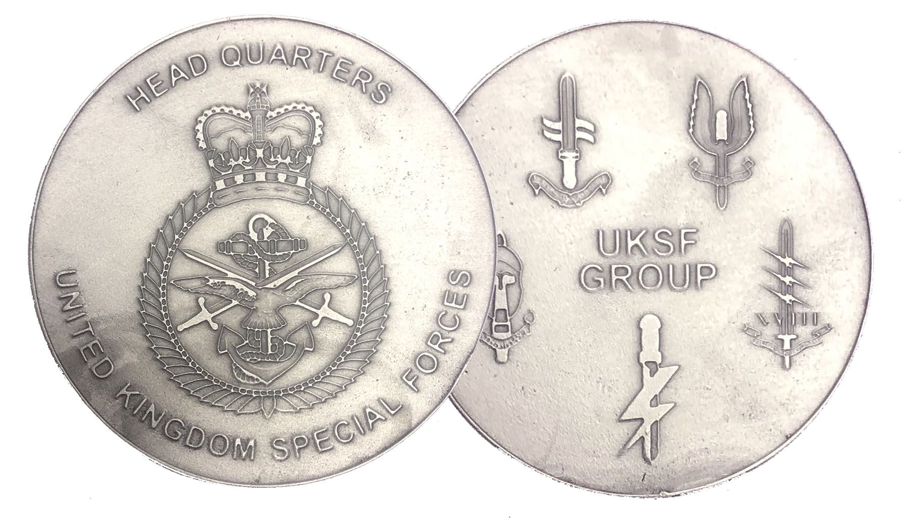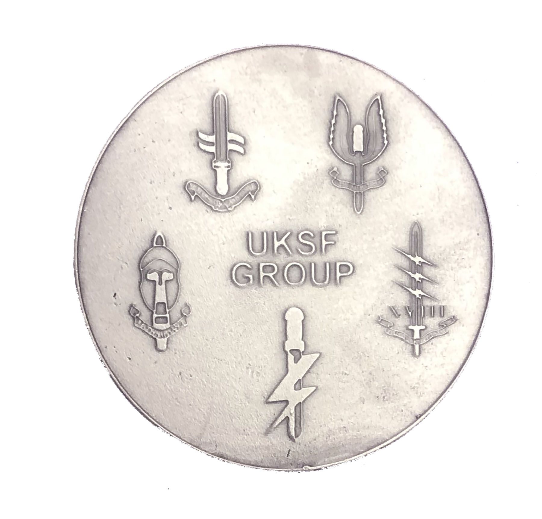 On the reverse of the coin has insignia of the Special Boat Service (SBS), The Special Air Service (SAS), 18 (UKSF) Signal Regiment, Special Reconnaissance Regiment (SRR) and Special Forces Support Group